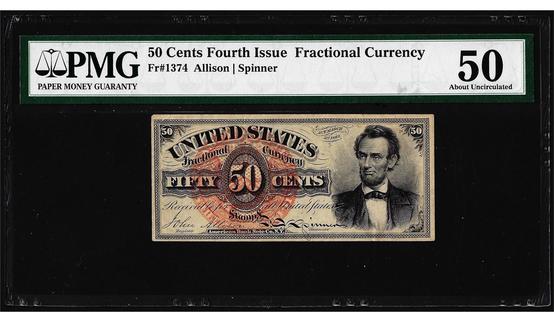 1863 Fourth Issue 50 Cents Lincoln Fractional Currency Note Fr.1374 PMG About Unc. 50