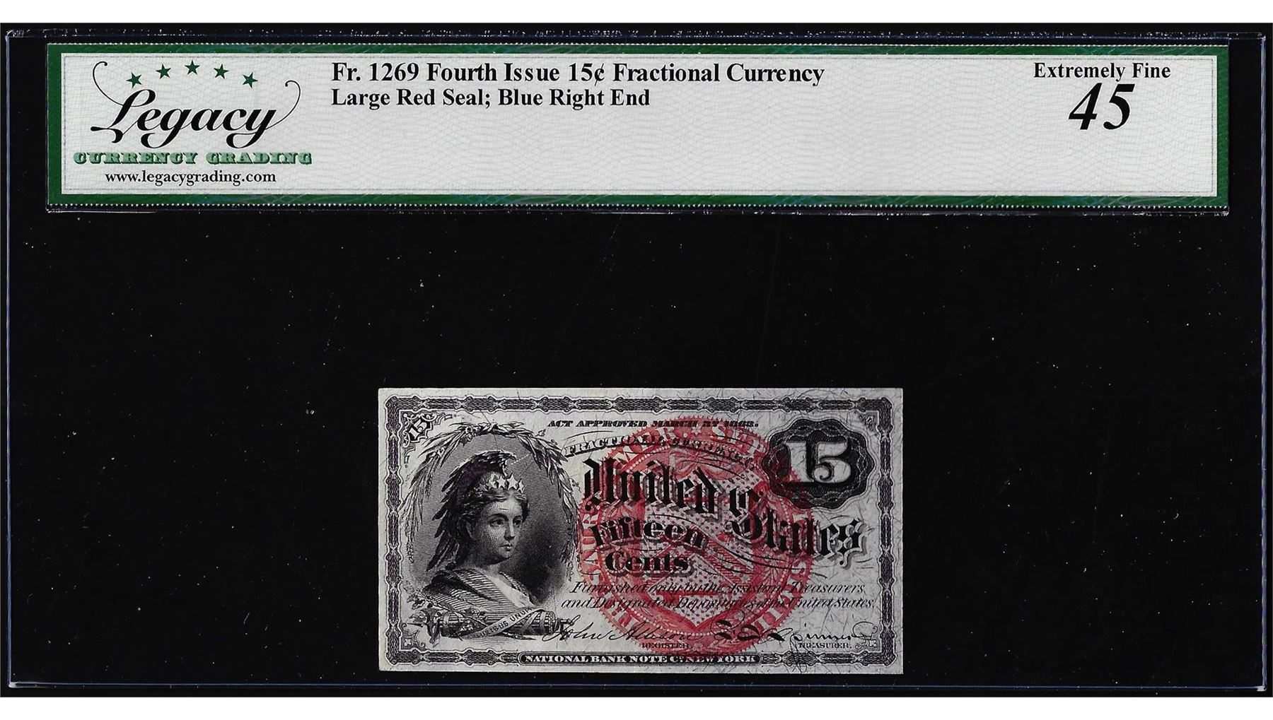 One 1863 Fourth Issue Fifteen Cents Fractional Note Fr.1269 Legacy Extremely Fine 45. Legacy Graded.