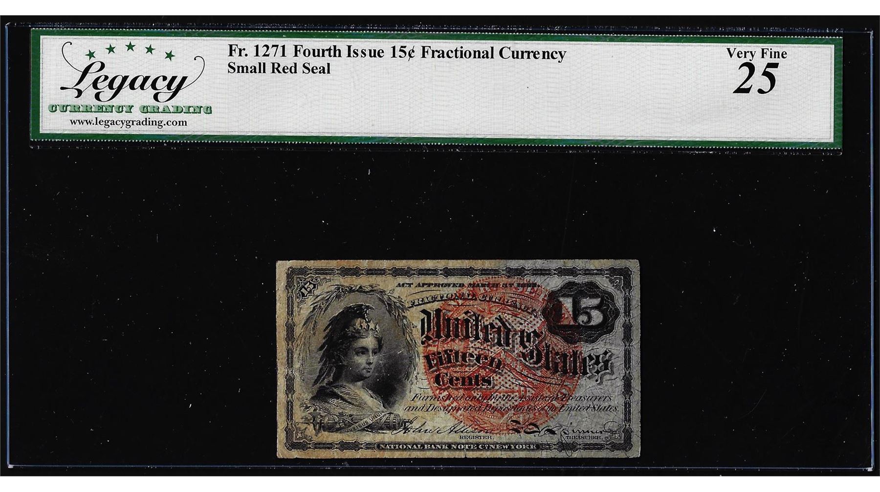 One 1863 Fourth Issue Fifteen Cents Fractional Note Fr.1271 Legacy Very Fine 25. Legacy Graded.