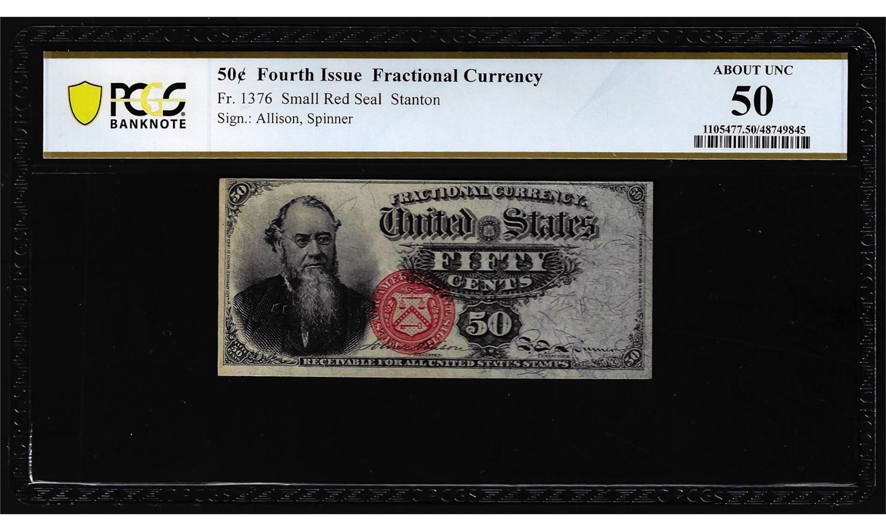 One 1863 Fourth Issue Fifty Cents Fractional Currency Note Fr.1376 PCGS About Unc 50. PCGS Graded.