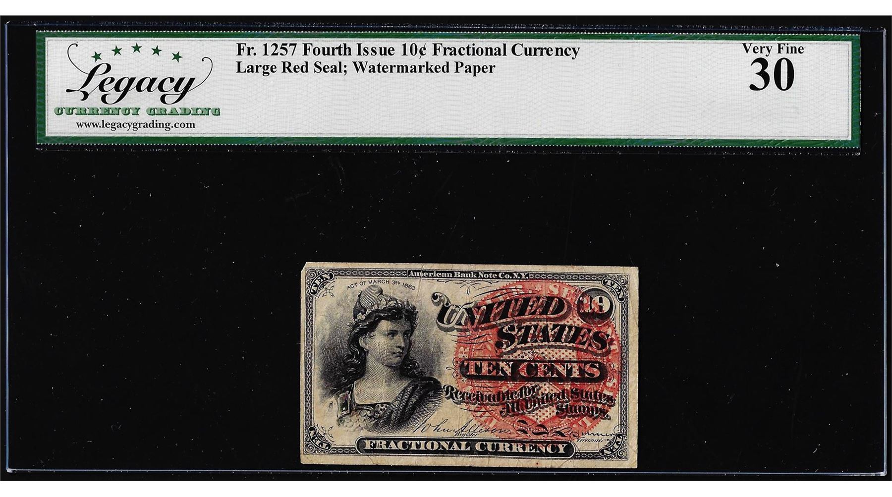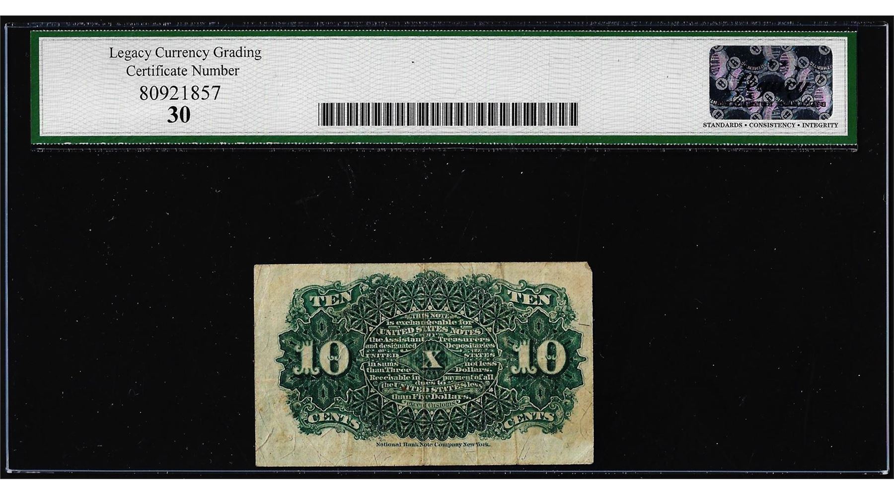 One 1863 Fourth Issue Ten Cents Fractional Currency Note Fr.1257 Legacy Very Fine 30. Legacy Graded.