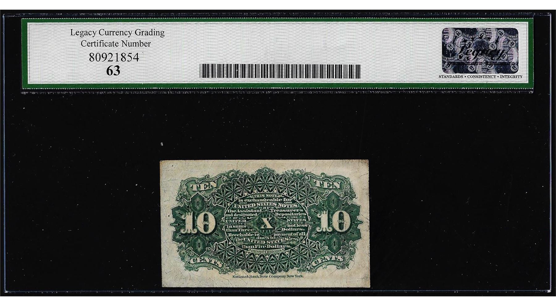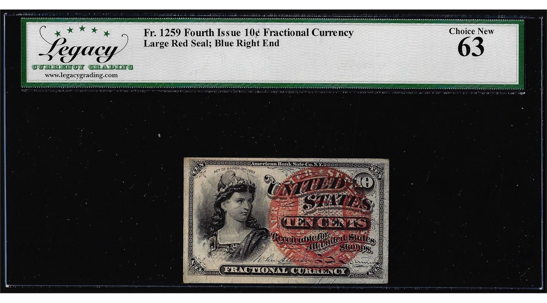 One 1863 Fourth Issue Ten Cents Fractional Currency Note Fr.1259 Legacy Choice New 63. Legacy Graded.