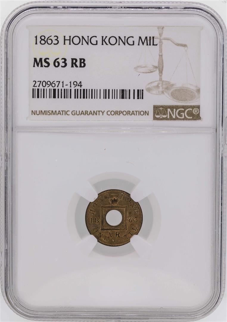 One 1863 Hong Kong One Mil Coin NGC MS63RB. NGC Certified.