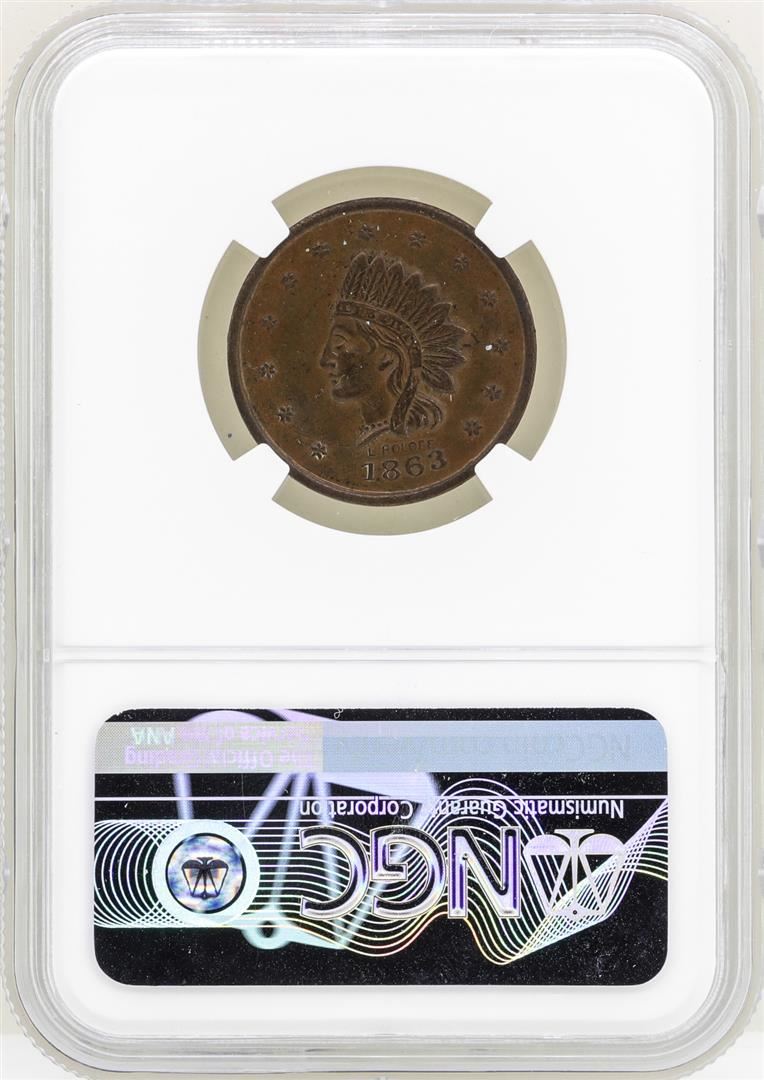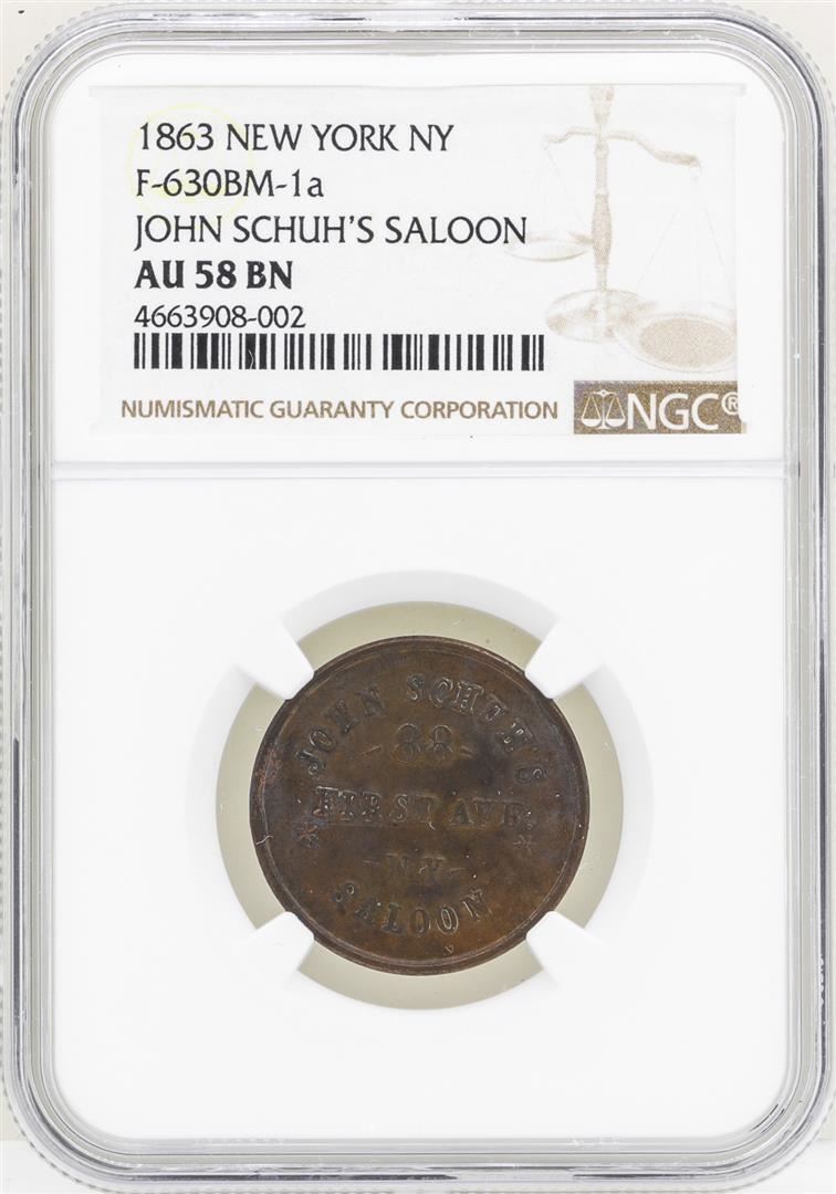 One 1863 New York, NY John Schuh's Saloon Token NGC AU58BN. NGC Certified.