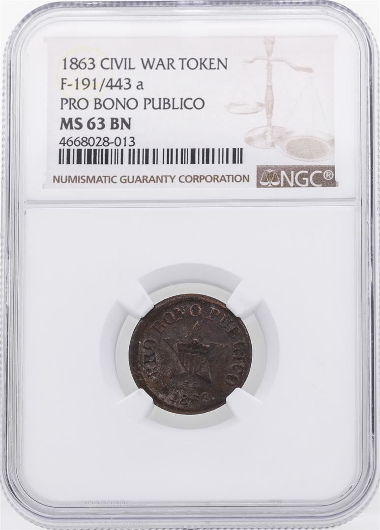 One 1863 Pro Bono Publico Civil War Token NGC MS63BN. NGC Certified.