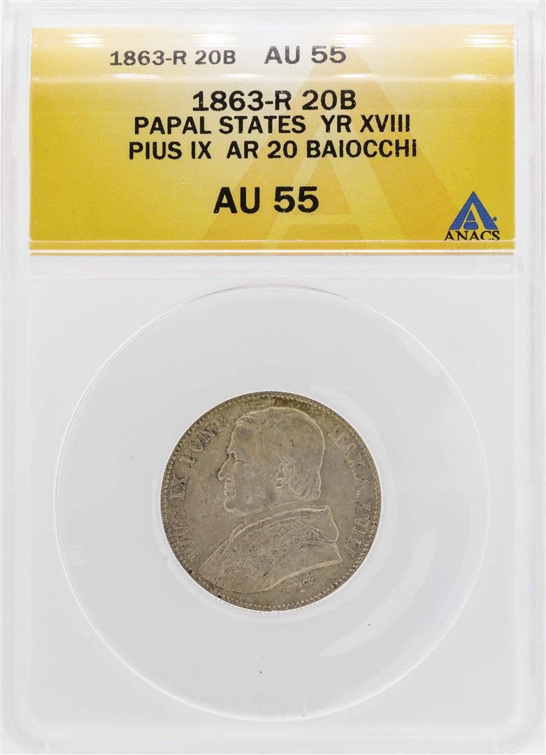 One 1863-R Italian 20 Baiocchi Papal States YR XVIII Silver Coin ANACS AU55. ANACS Certified.