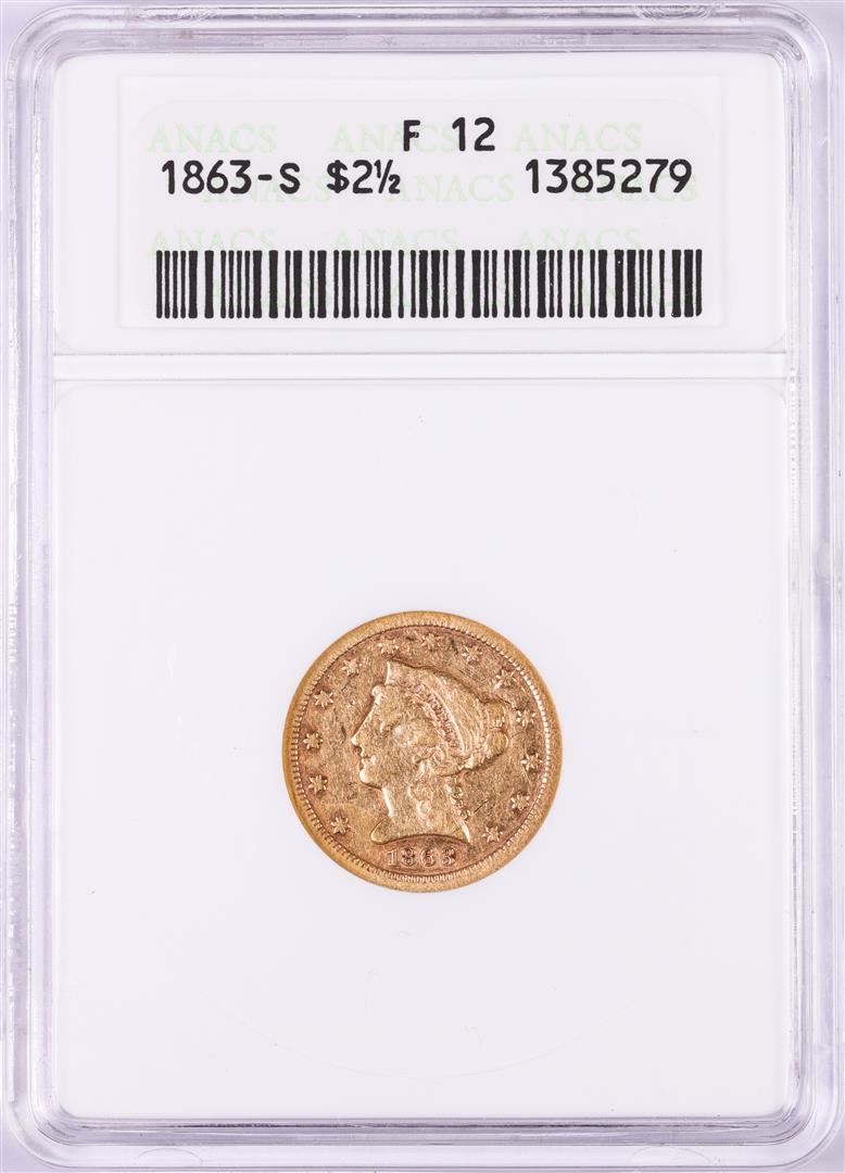 One 1863-S $2 1/2 Liberty Head Quarter Eagle Gold Coin ANACS F12. ANACS Certified.