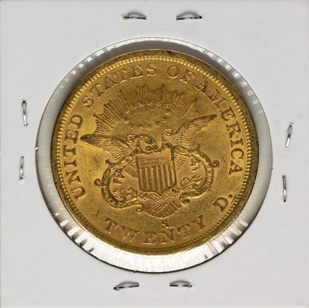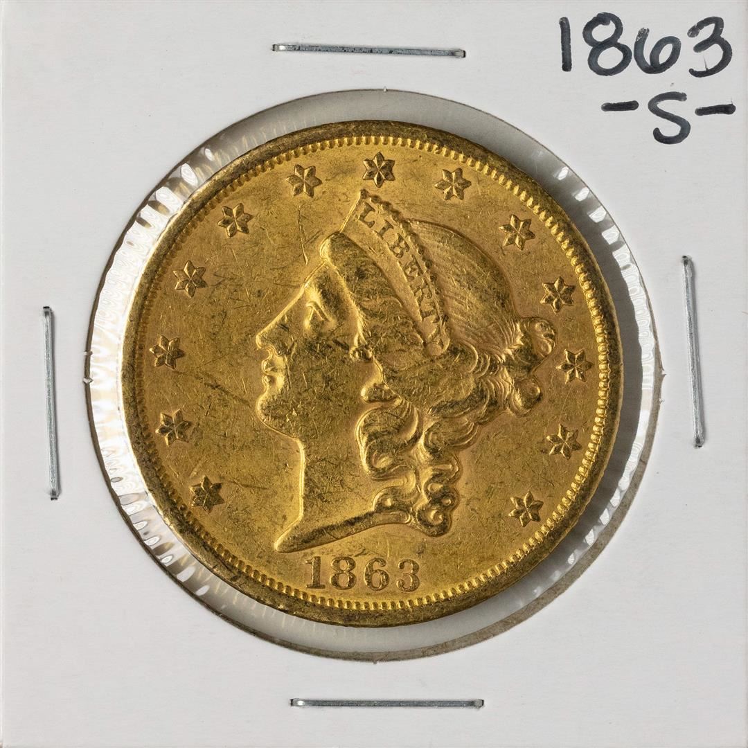 One 1863-S $20 Liberty Head Double Eagle Gold Coin.
