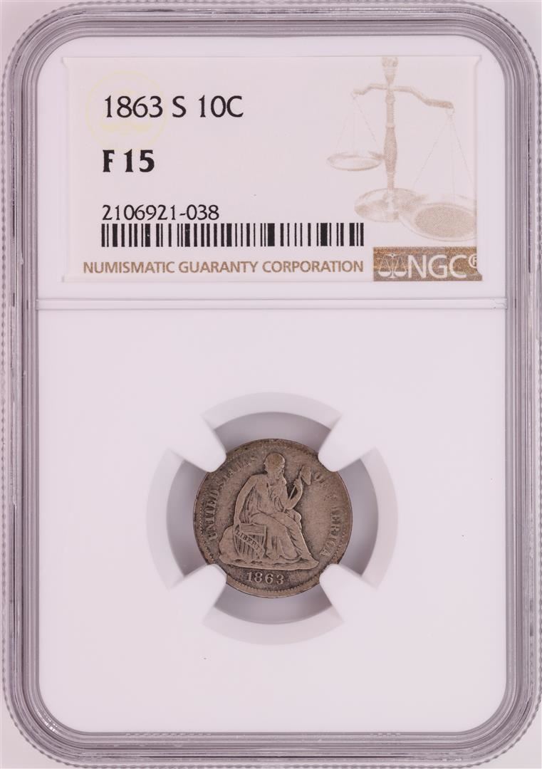 One 1863-S Seated Liberty Dime Coin NGC F15. NGC Certified.