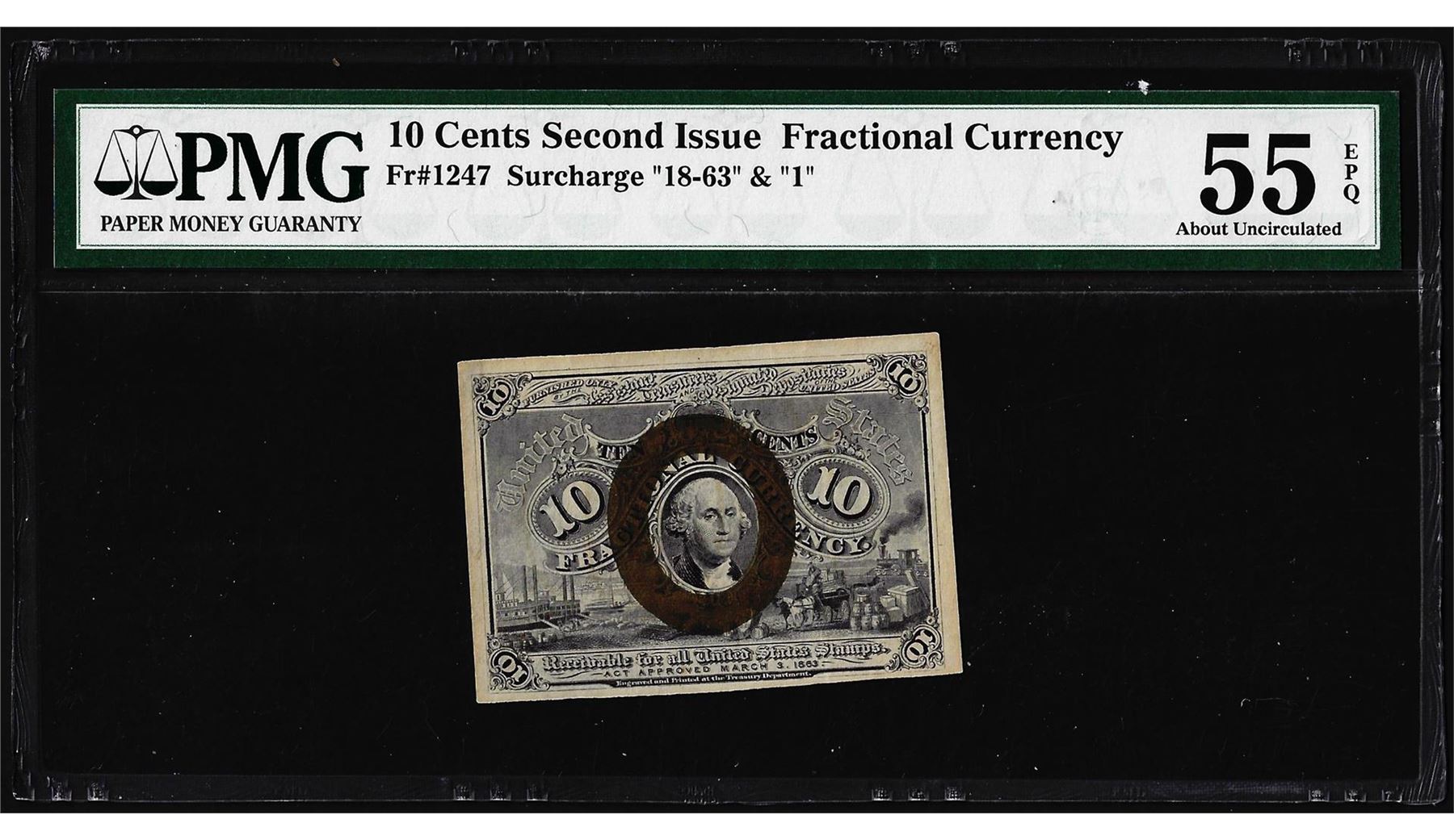 One 1863 Second Issue 10 Cent Fractional Currency Note Fr.1247 PMG About Uncirculated 55EPQ. PMG Certified.