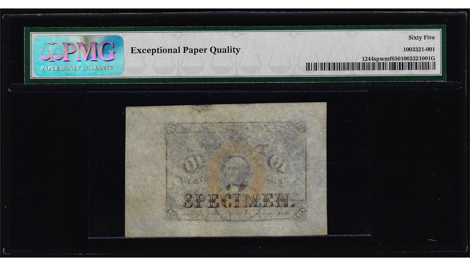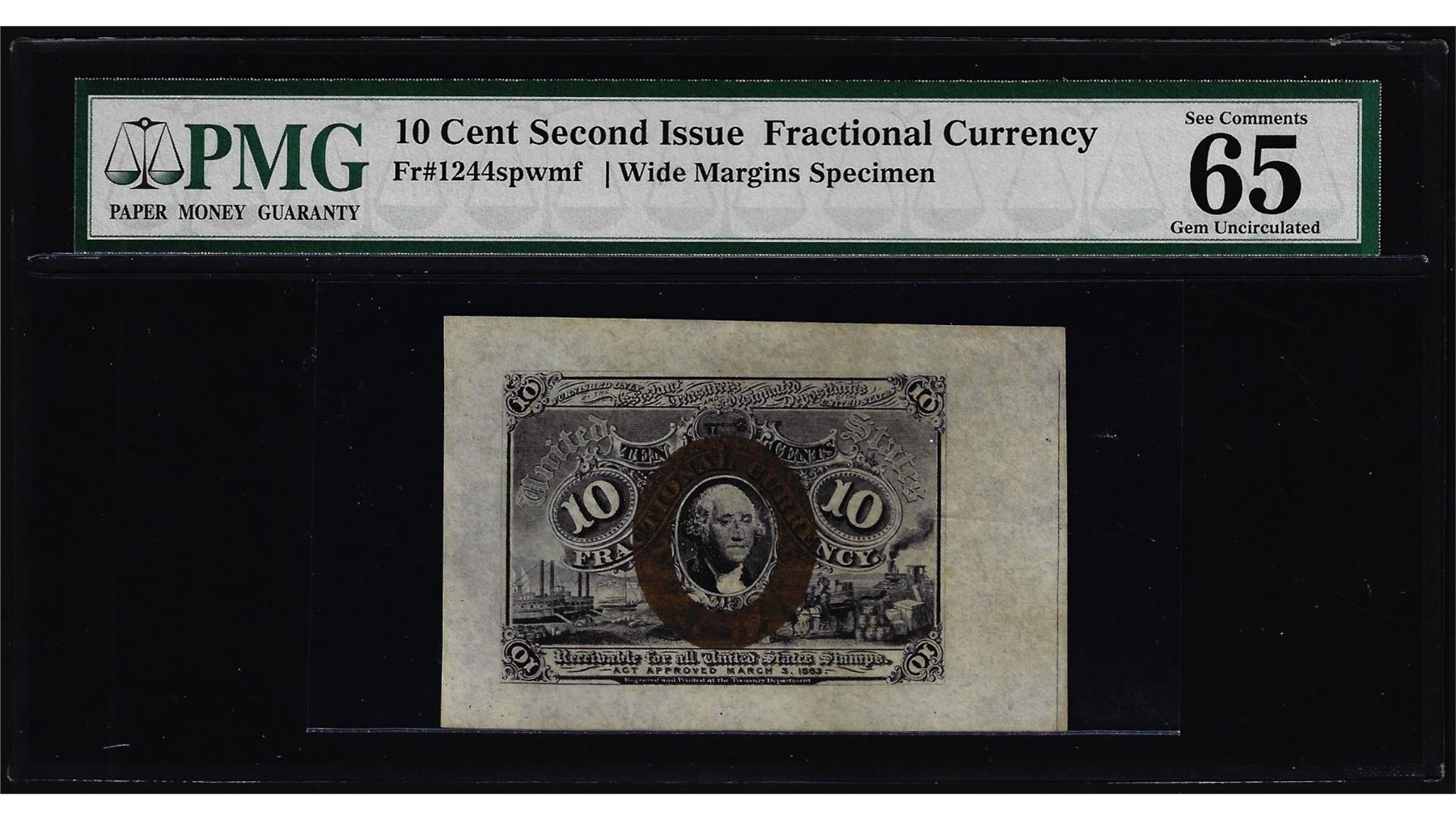 One 1863 Second Issue 10 Cents Specimen Fractional Note Fr.1244sp PMG Gem Unc 65EPQ. PMG Certified.