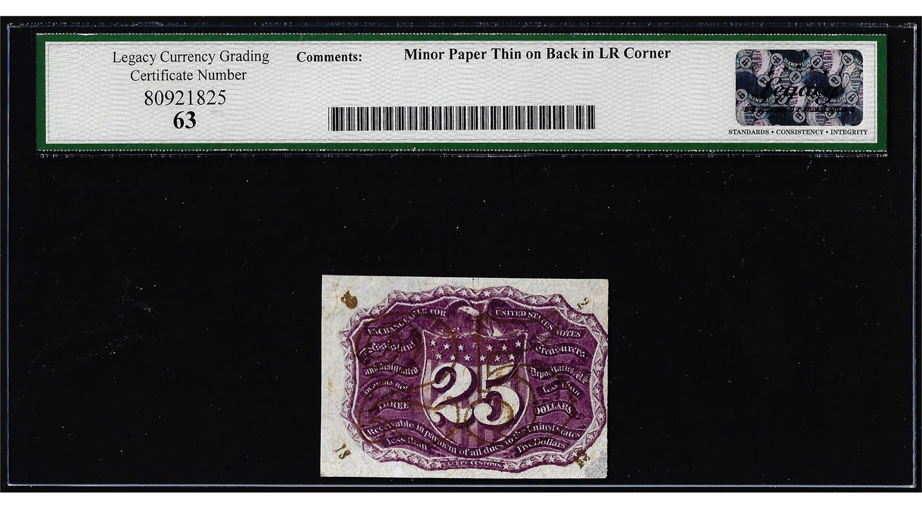 One 1863 Second Issue 25 Cents Fractional Currency Note Fr.1290 Legacy Choice New 63. Legacy Graded.