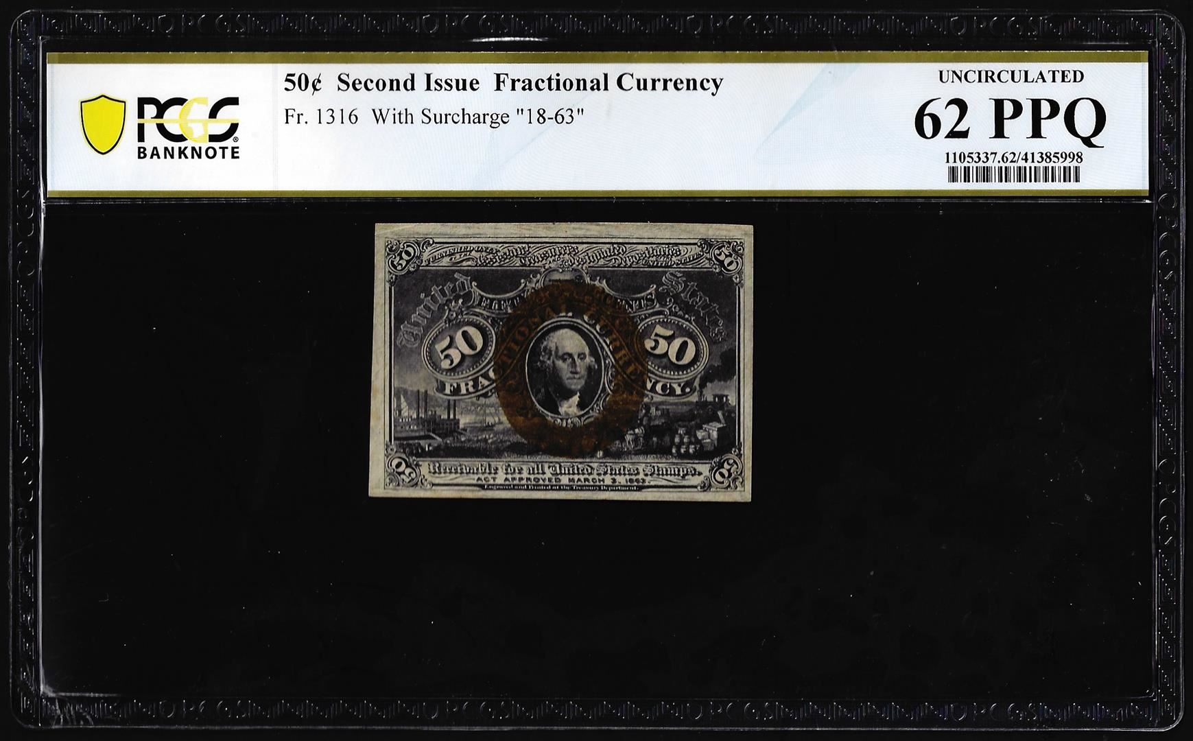 One 1863 Second Issue Five Cents Fractional Currency Note Fr.1316 PCGS Uncirculated 62PPQ. PCGS Graded.