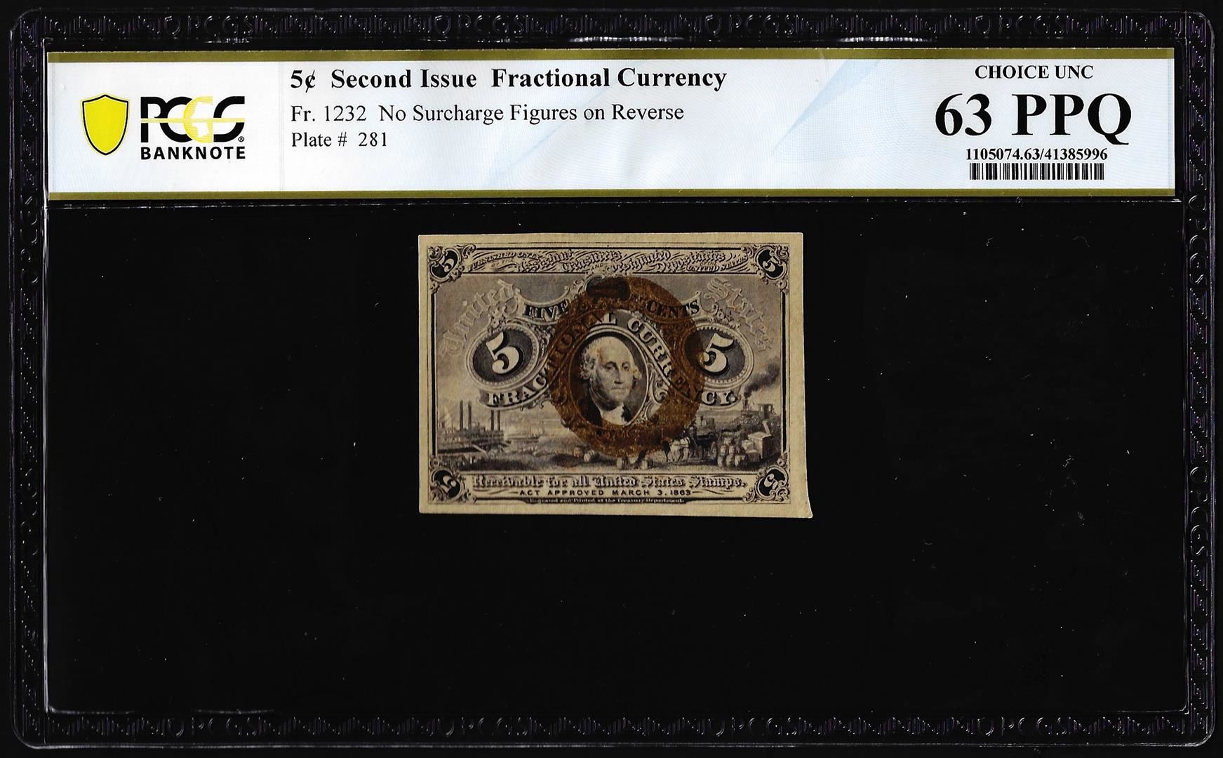 One 1863 Second Issue Five Cents Fractional Note Fr.1232 PCGS Choice Uncirculated 63PPQ. PCGS Graded.