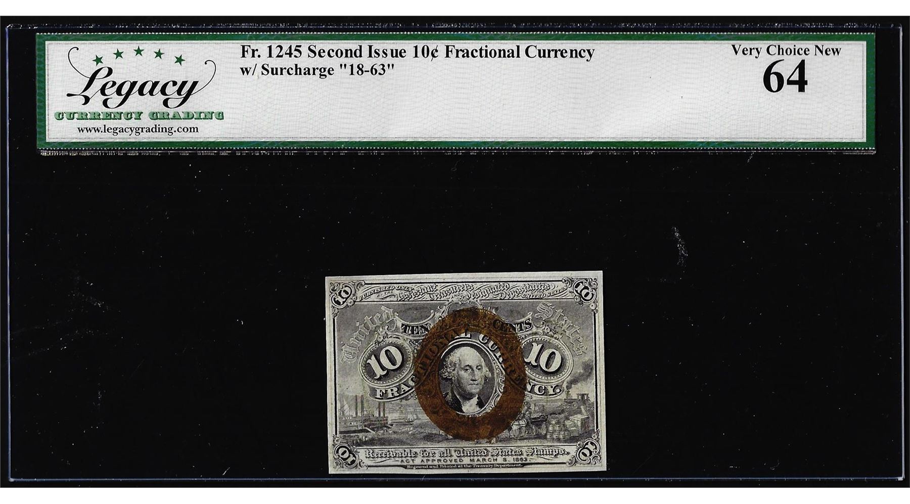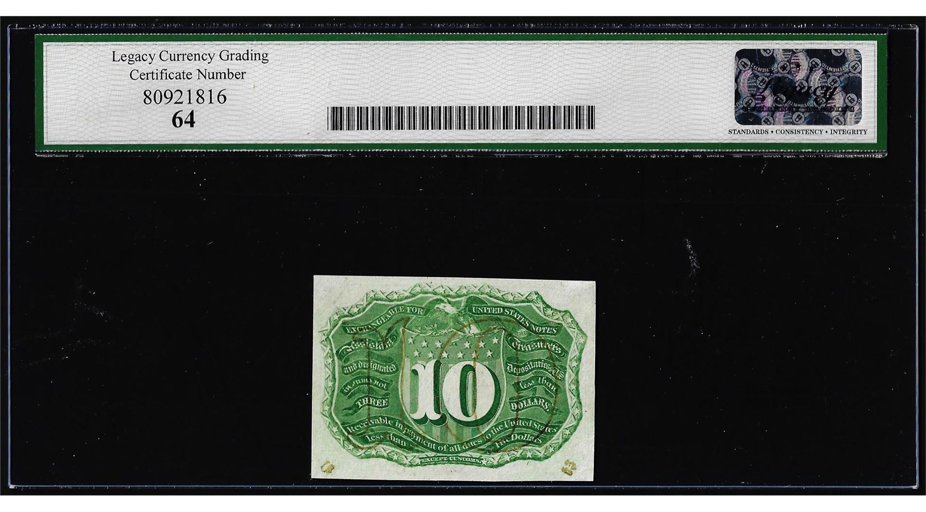 One 1863 Second Issue Ten Cents Fractional Currency Note Fr.1245 Legacy Very Choice New 64. Legacy Graded.