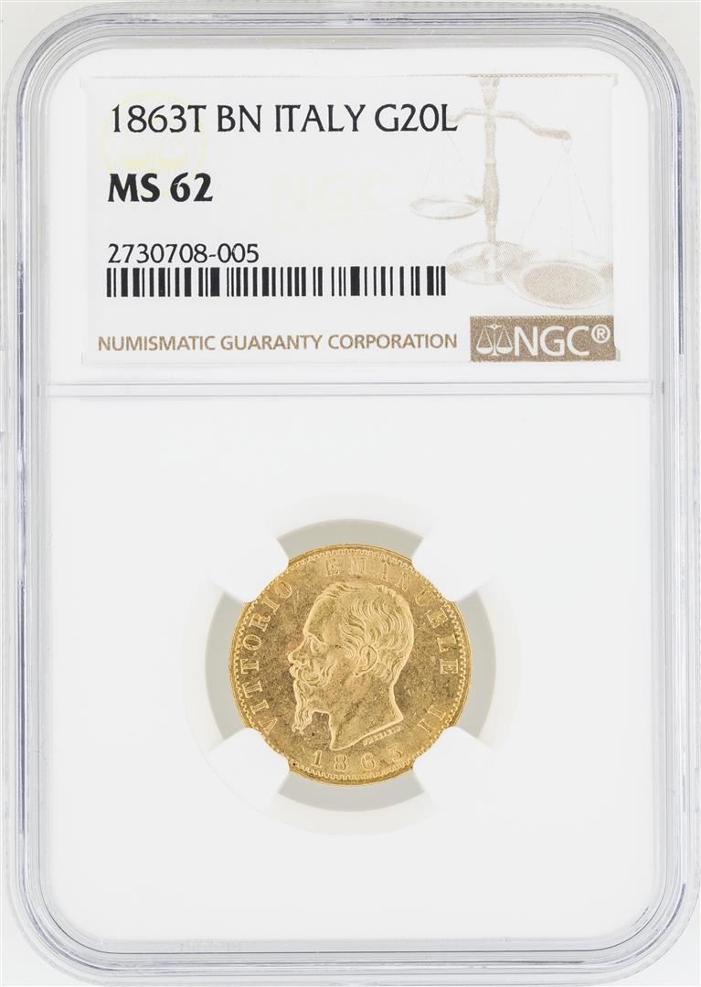 One 1863-T Italy 20 Lira BN Victor Emanuel Gold Coin NGC MS62. NGC Certified.