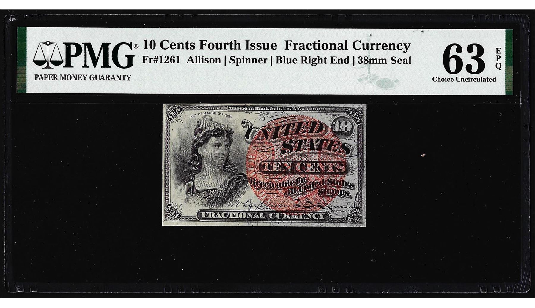 One 1863 Ten Cents Fourth Issue Fractional Note Fr.1261 PMG Choice Uncirculated 63EPQ. PMG Certified.