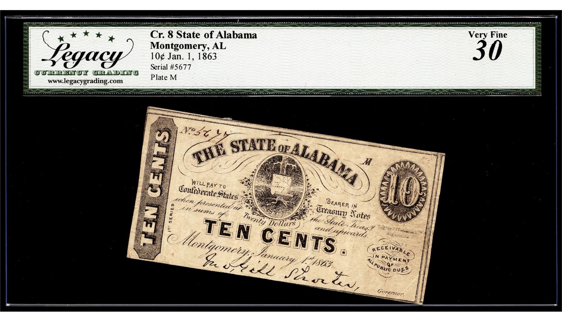 One 1863 Ten Cents The State of Alabama Montgomery, AL Obsolete Note Legacy Very Fine 30. Legacy Graded.