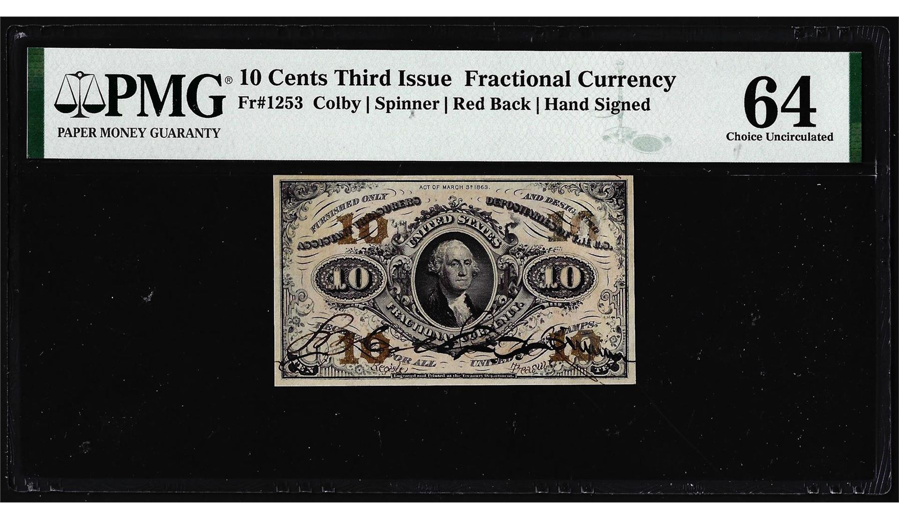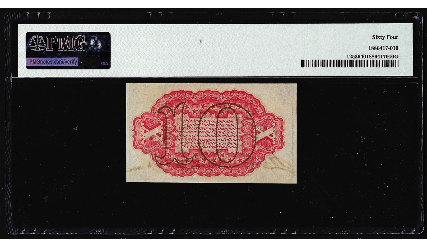 One 1863 Ten Cents Third Issue Fractional Currency Note Fr.1253 PMG Choice Uncirculated 64. PMG Certified.
