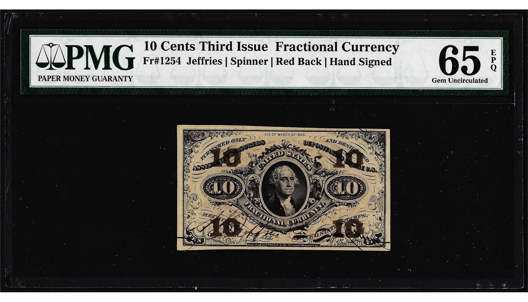 One 1863 Ten Cents Third Issue Fractional Currency Note Fr.1254 PMG Gem Uncirculated 65EPQ.