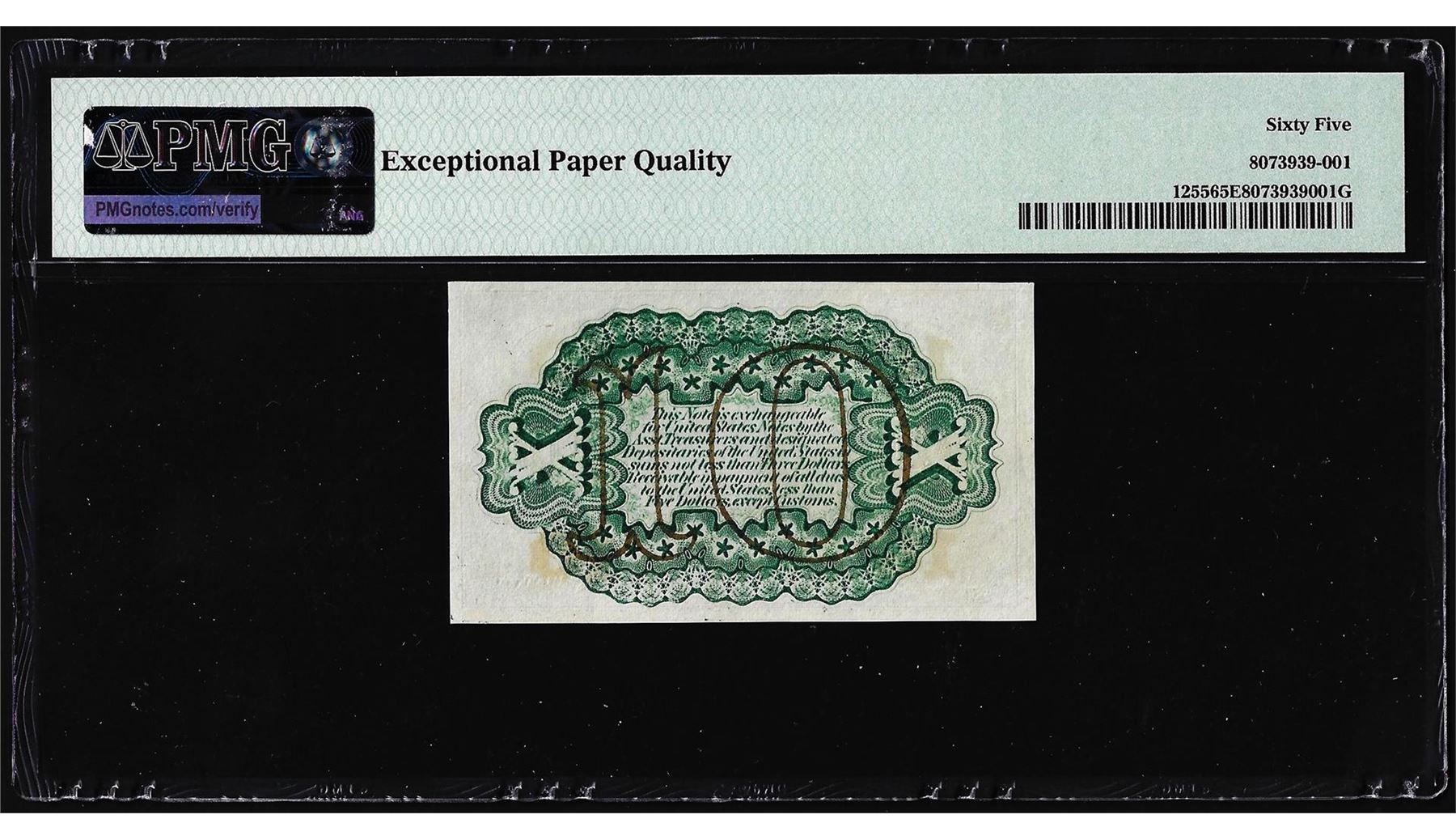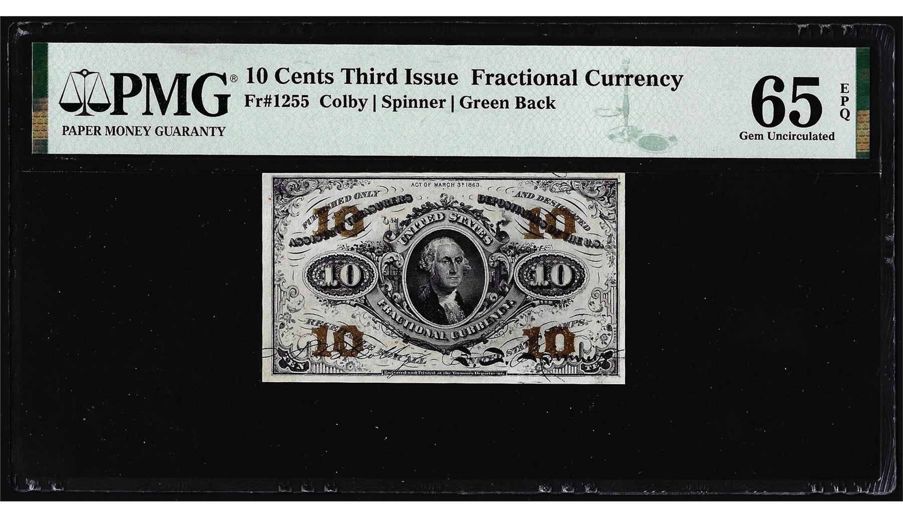 One 1863 Ten Cents Third Issue Fractional Currency Note Fr.1255 PMG Gem Uncirculated 65EPQ. PMG Certified.