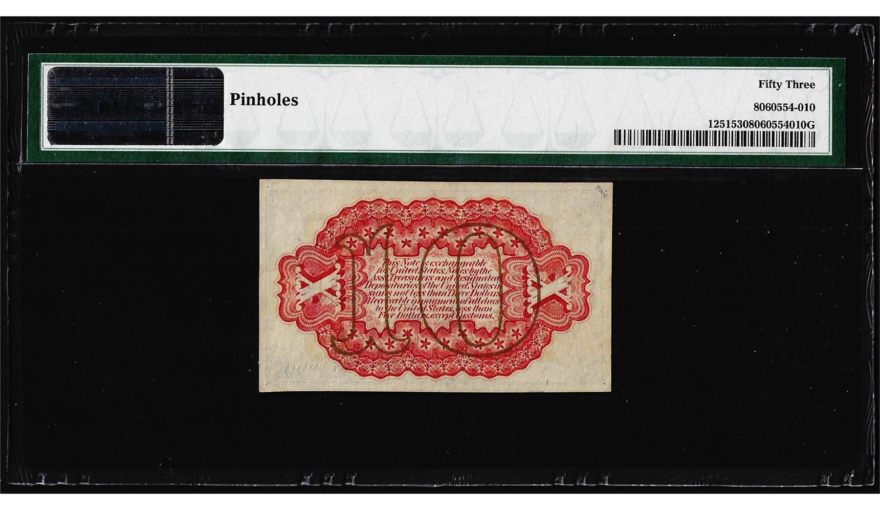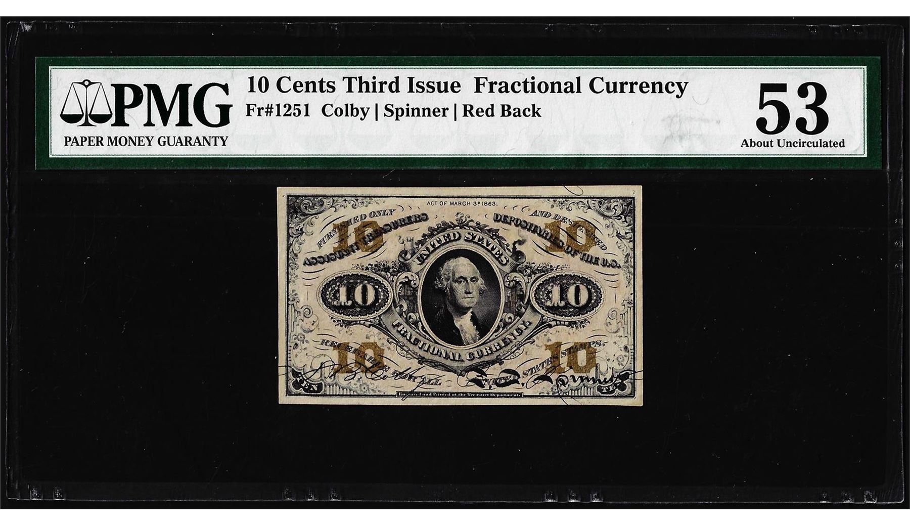 One 1863 Third Issue 10 Cent Fractional Currency Note Fr.1251 PMG About Uncirculated 53. PMG Certified.