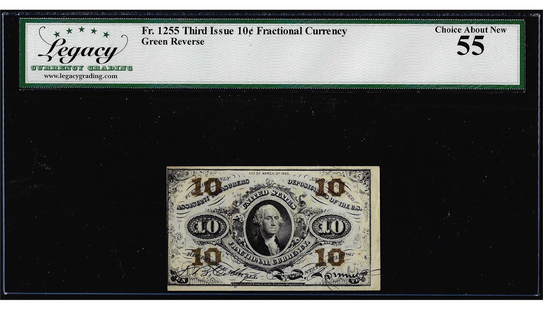 One 1863 Third Issue 10 Cents Fractional Currency Note Fr.1255 Legacy Choice About New 55. Legacy Graded.