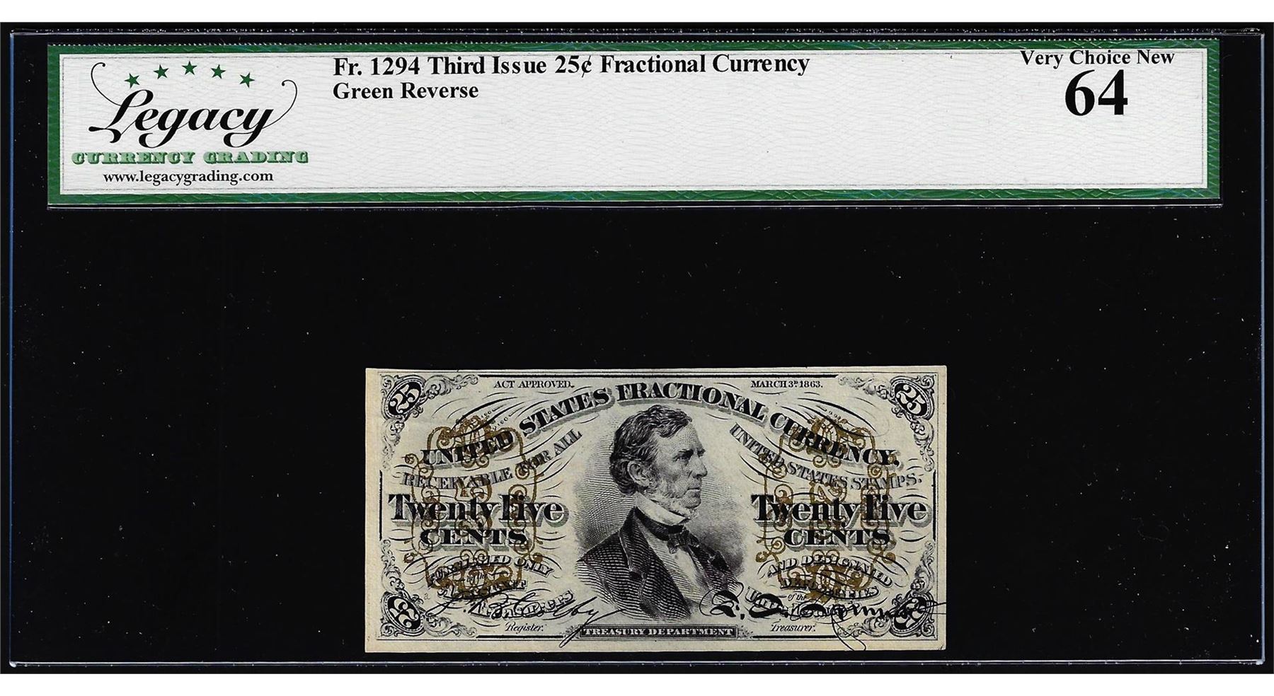 One 1863 Third Issue 25 Cents Fractional Currency Note Fr.1294 Legacy Very Choice New 64. Legacy Graded.