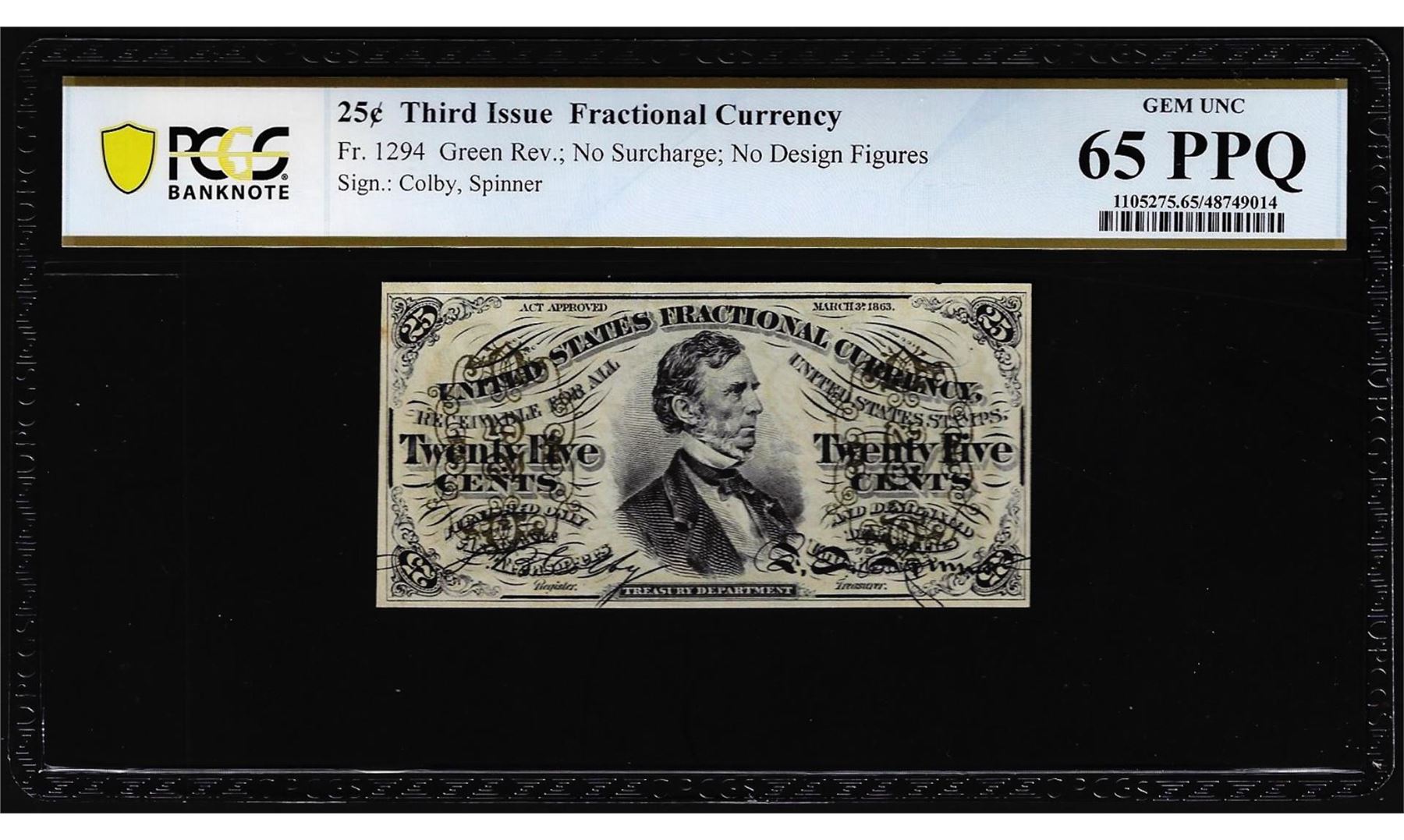 One 1863 Third Issue 25 Cents Fractional Currency Note Fr.1294 PCGS Gem Unc 65PPQ. PCGS Graded.