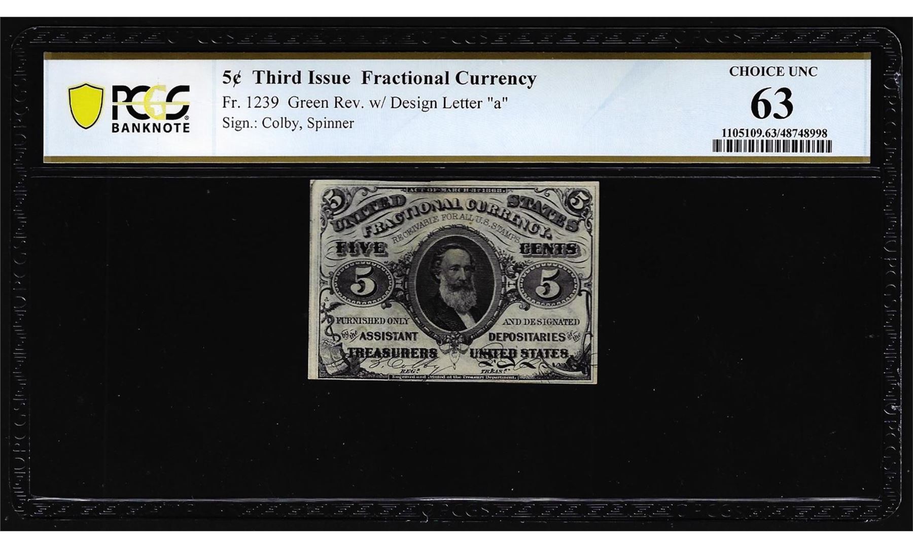 One 1863 Third Issue 5 Cents Fractional Currency Note Fr.1239 PCGS Choice Uncirculated 63. PCGS Graded.