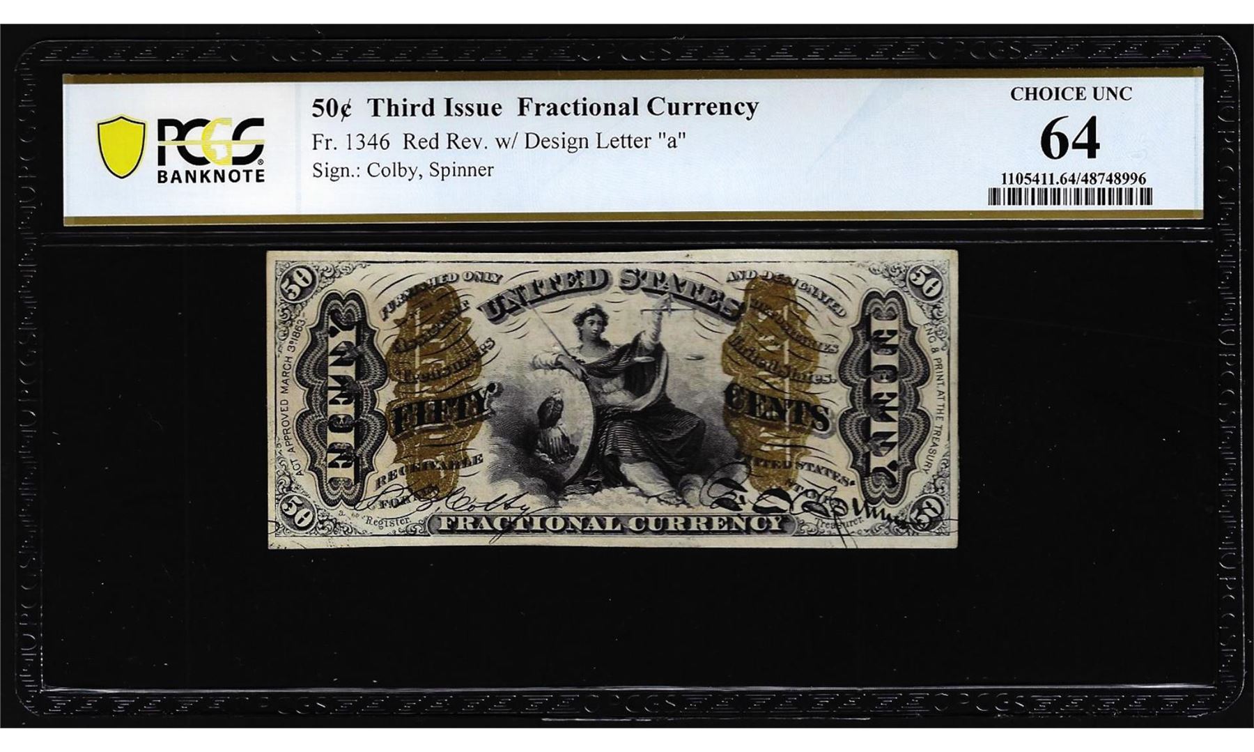 One 1863 Third Issue 50 Cents Fractional Currency Note Fr.1346 PCGS Ch. Uncirculated 64. PCGS Graded.