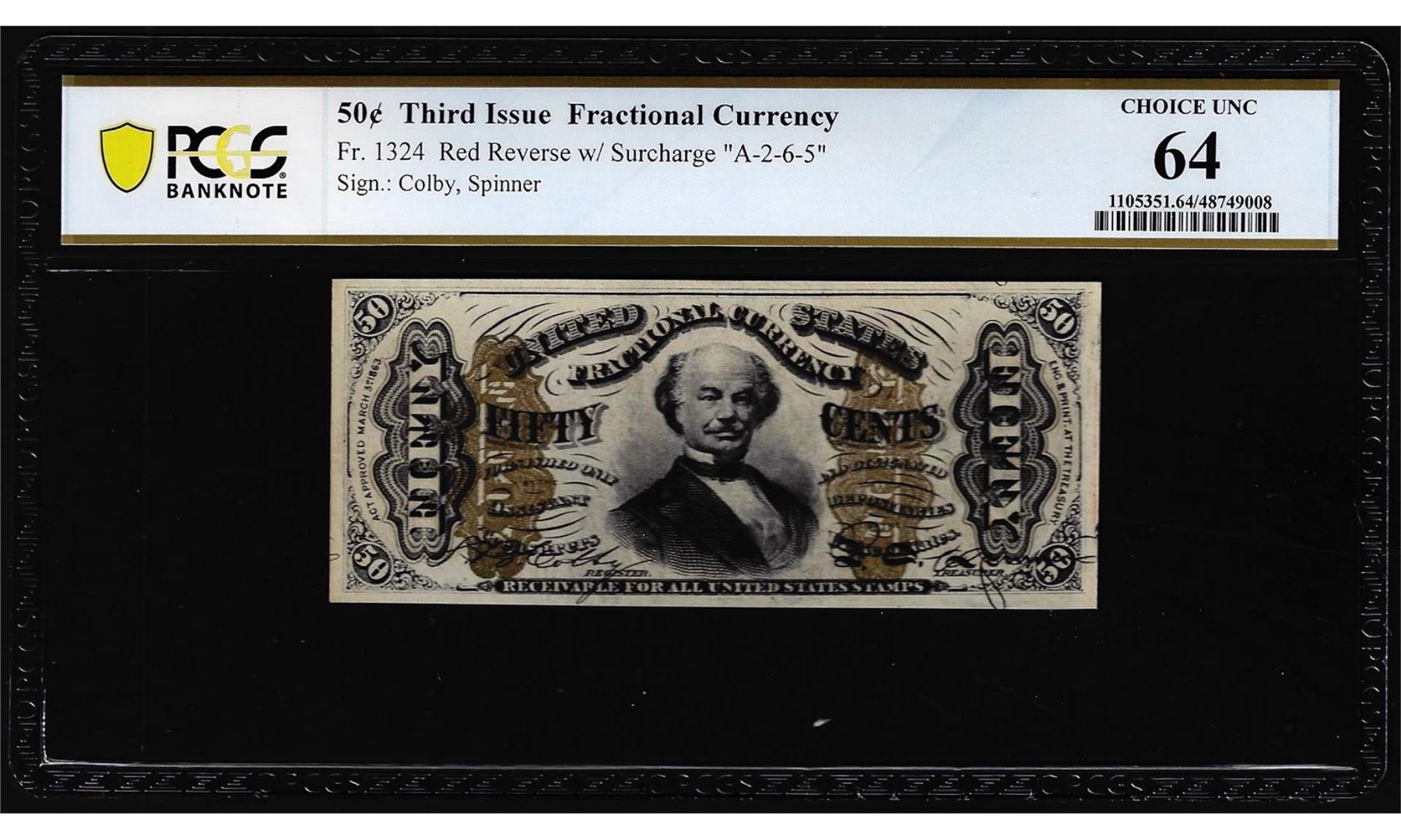 One 1863 Third Issue Fifty Cents Fractional Currency Note Fr.1324 PCGS Choice Unc 64. PCGS Graded.