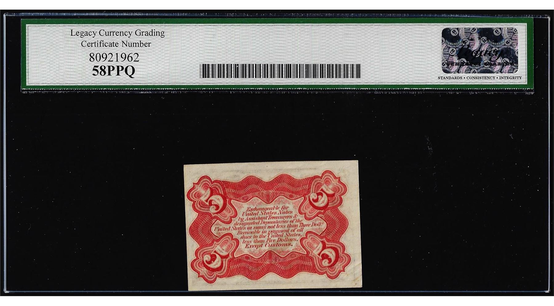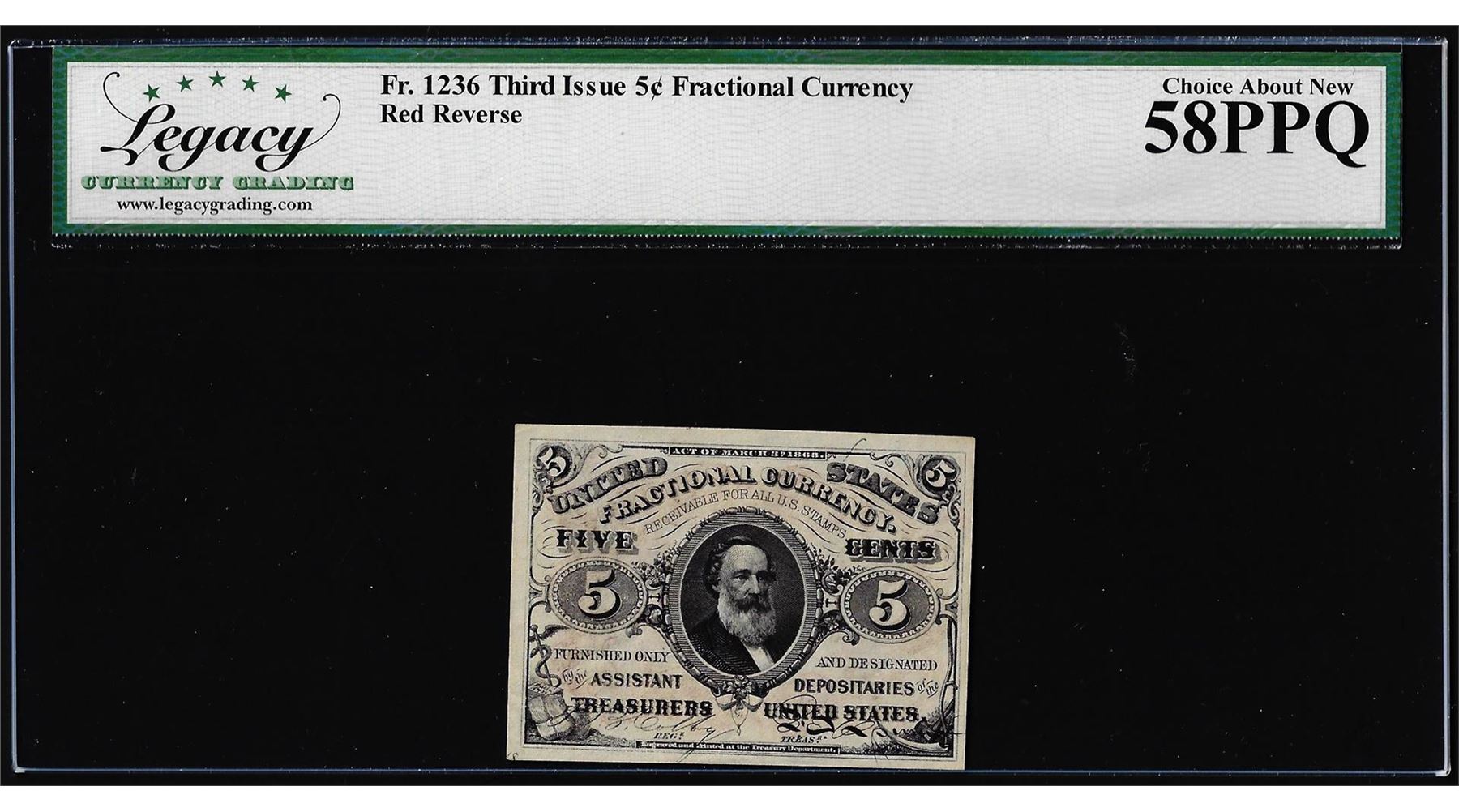 One 1863 Third Issue Five Cents Fractional Note Fr.1236 Legacy Choice About New 58PPQ. Legacy Graded.