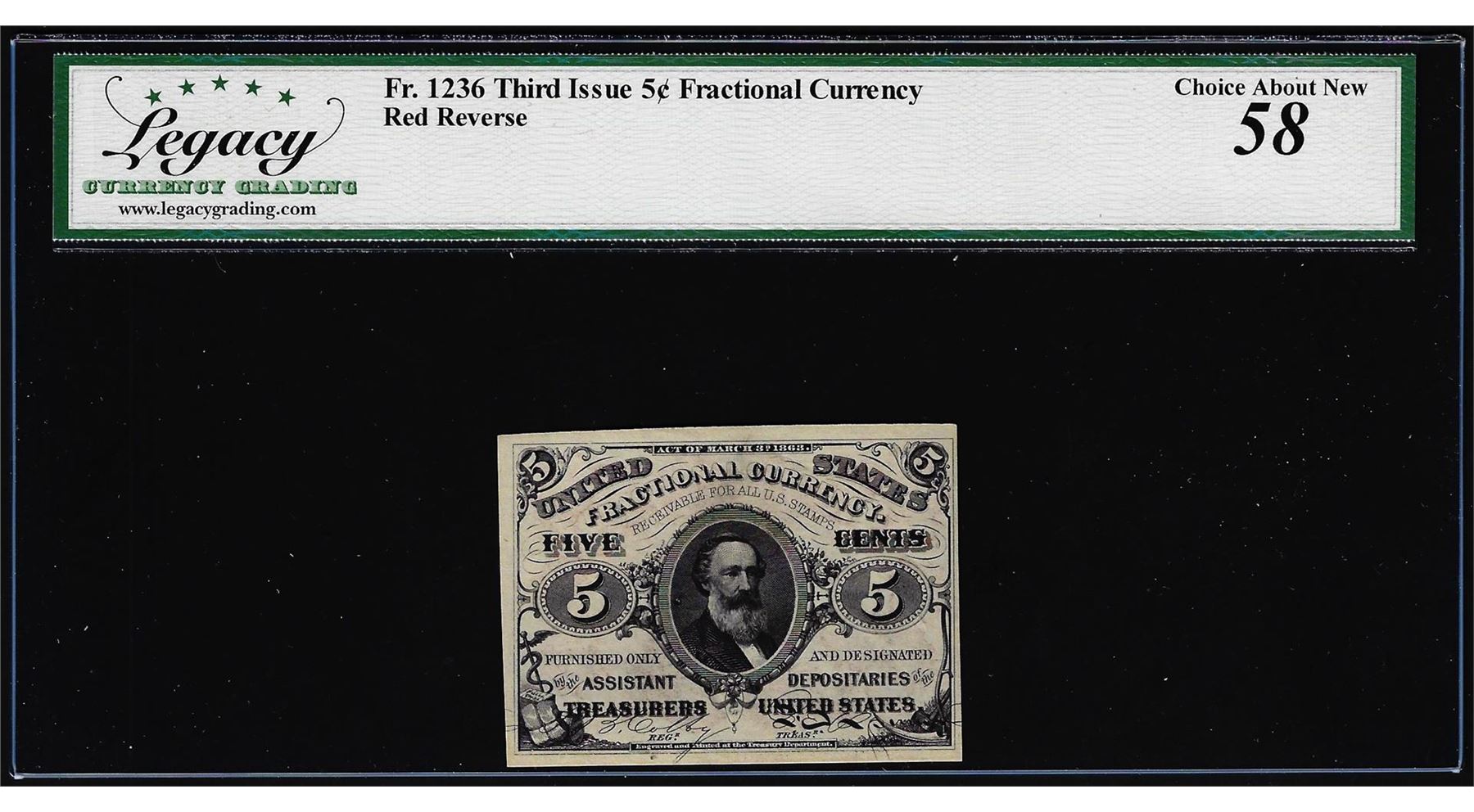 One 1863 Third Issue Five Cents Fractional Note Fr.1236 Legacy Choice About New 58. Legacy Graded.