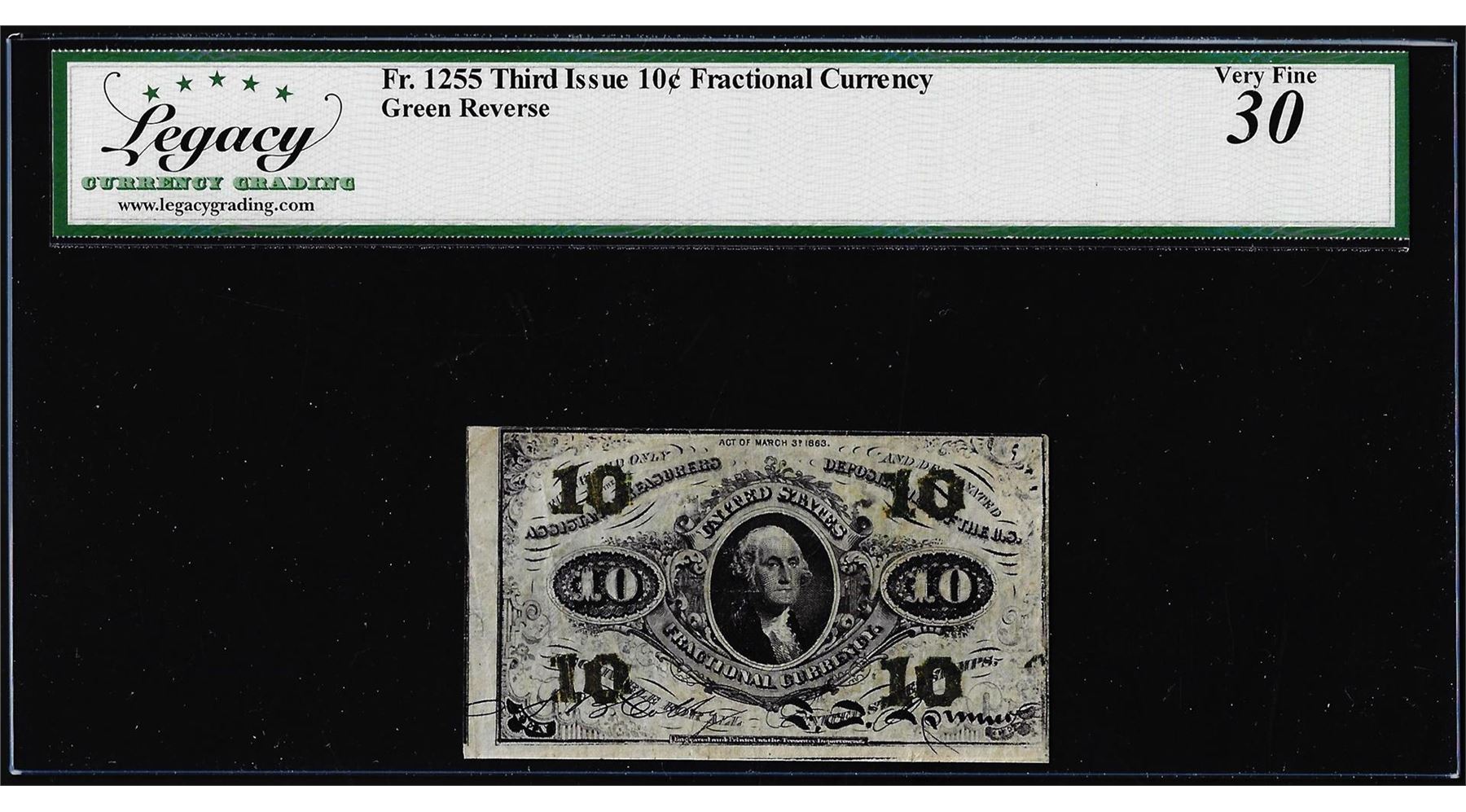 One 1863 Third Issue Ten Cents Fractional Currency Note Fr.1255 Legacy Very Fine 30. Legacy Graded.