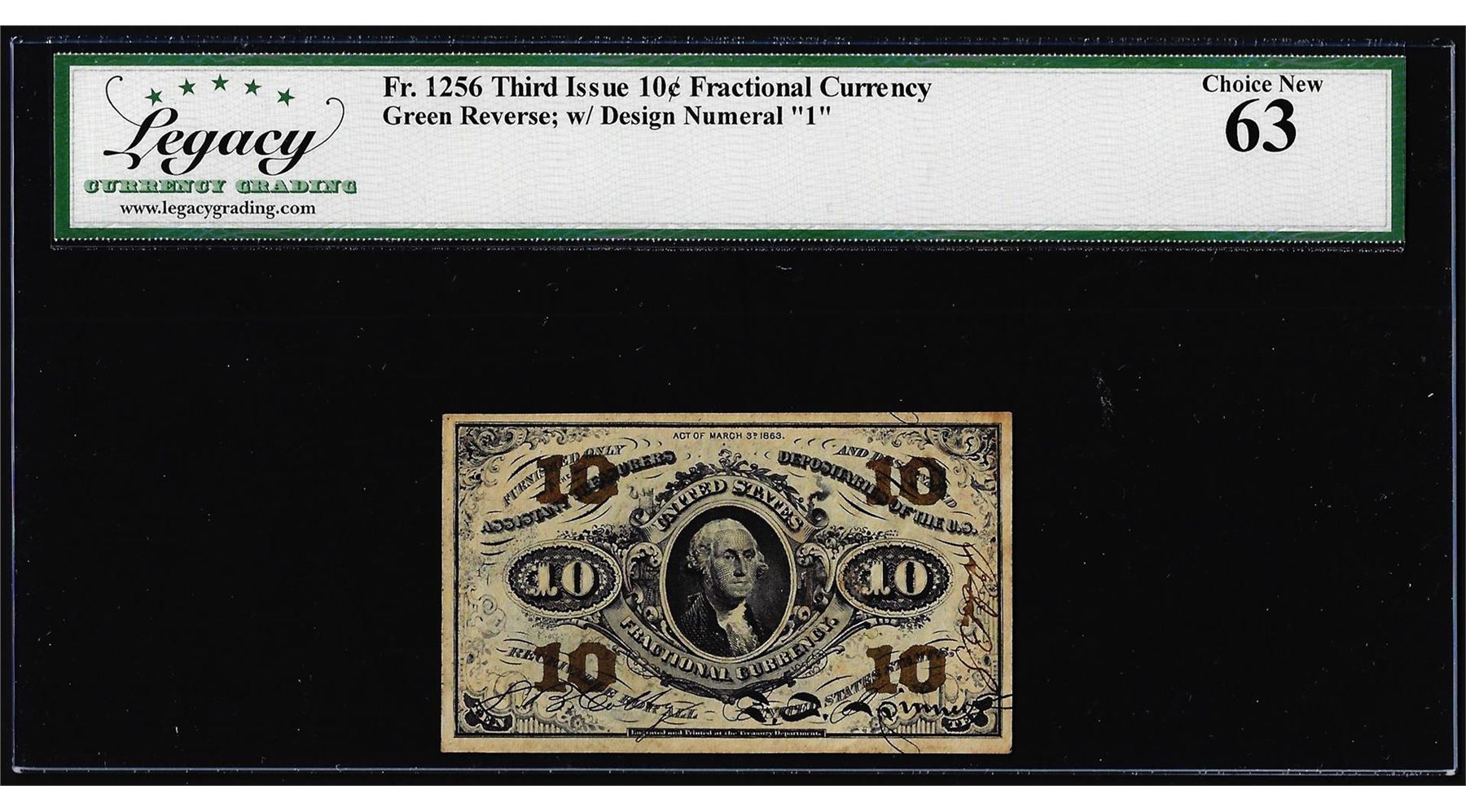 One 1863 Third Issue Ten Cents Fractional Note Fr.1256 Legacy Choice New 63. Legacy Graded.