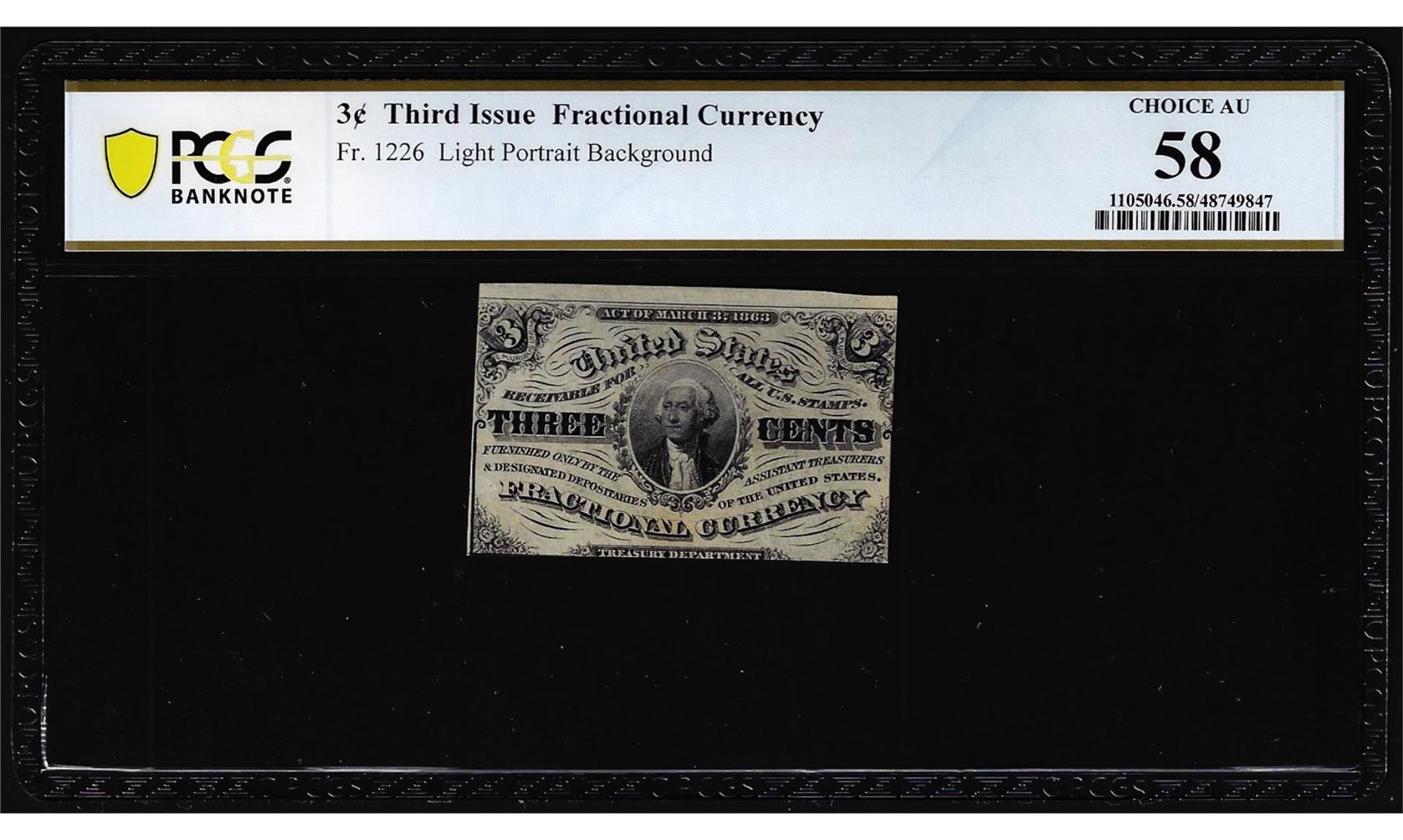 One 1863 Third Issue Three Cents Fractional Currency Note Fr.1226 PCGS Choice AU 58. PCGS Graded.