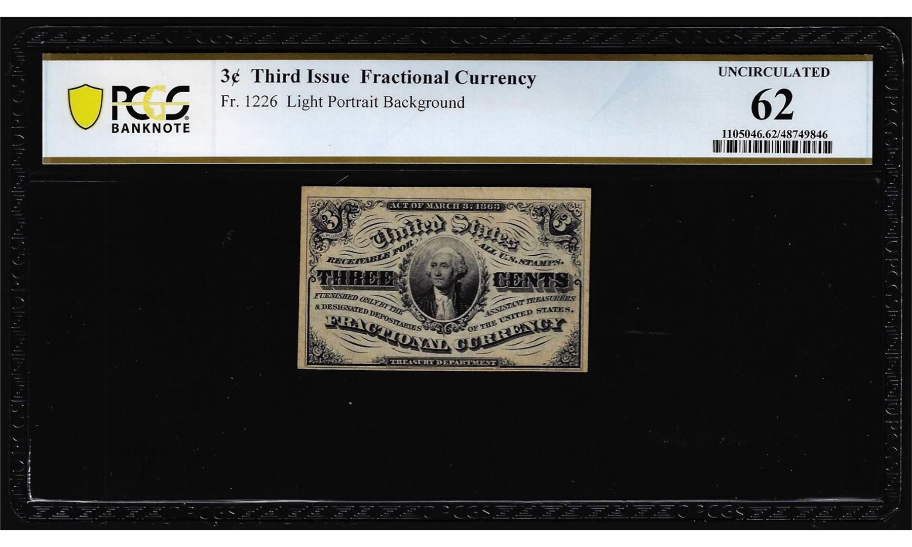 One 1863 Third Issue Three Cents Fractional Currency Note Fr.1226 PCGS Uncirculated 62. PCGS Graded.