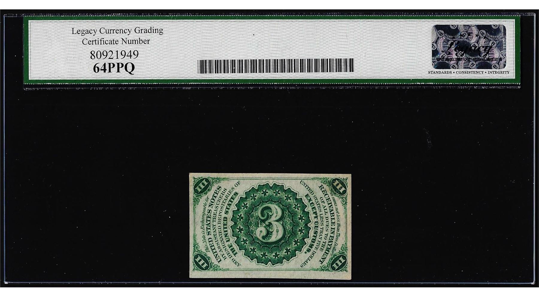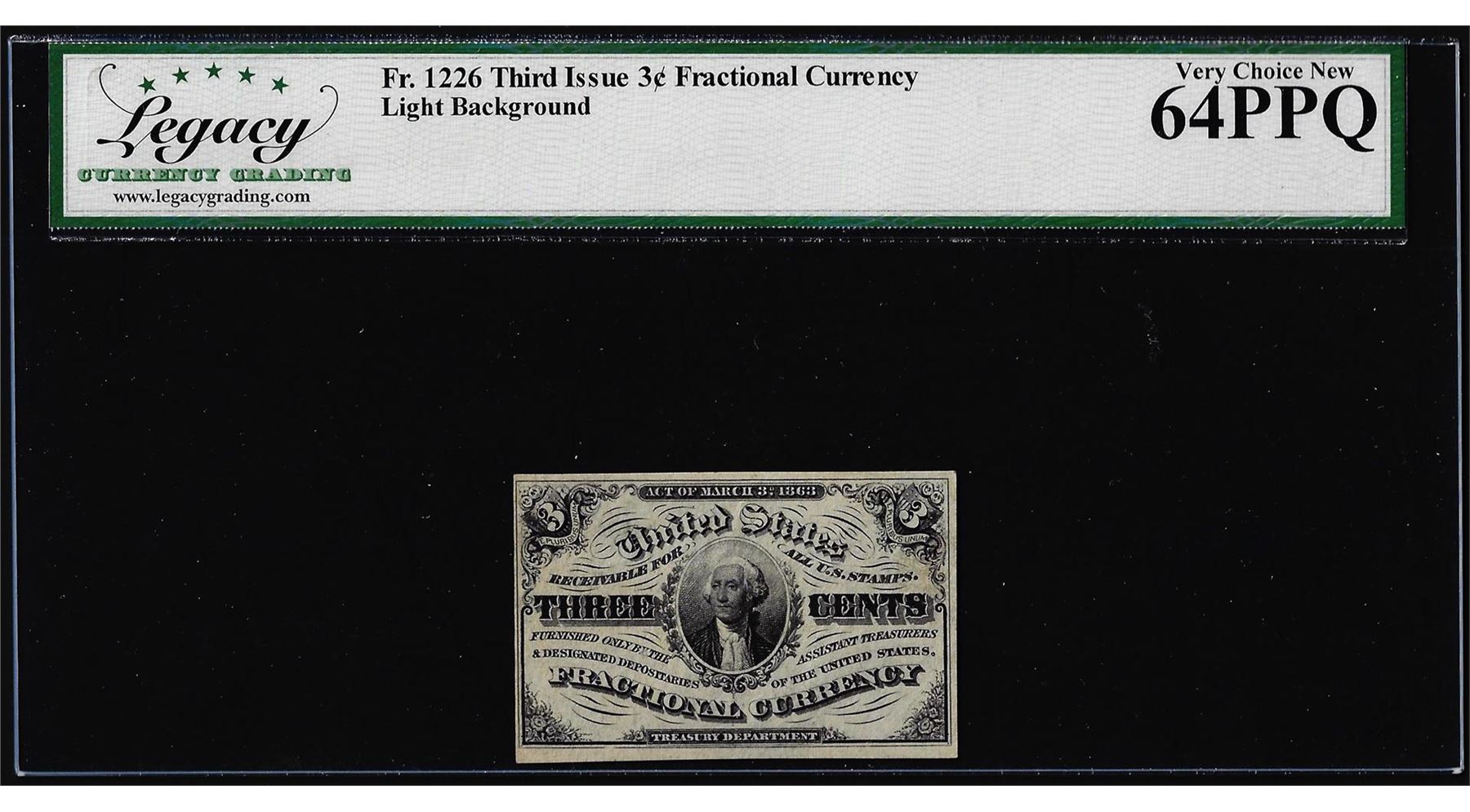 One 1863 Third Issue Three Cents Fractional Note Fr.1226 Legacy Very Choice New 64PPQ. Legacy Graded.