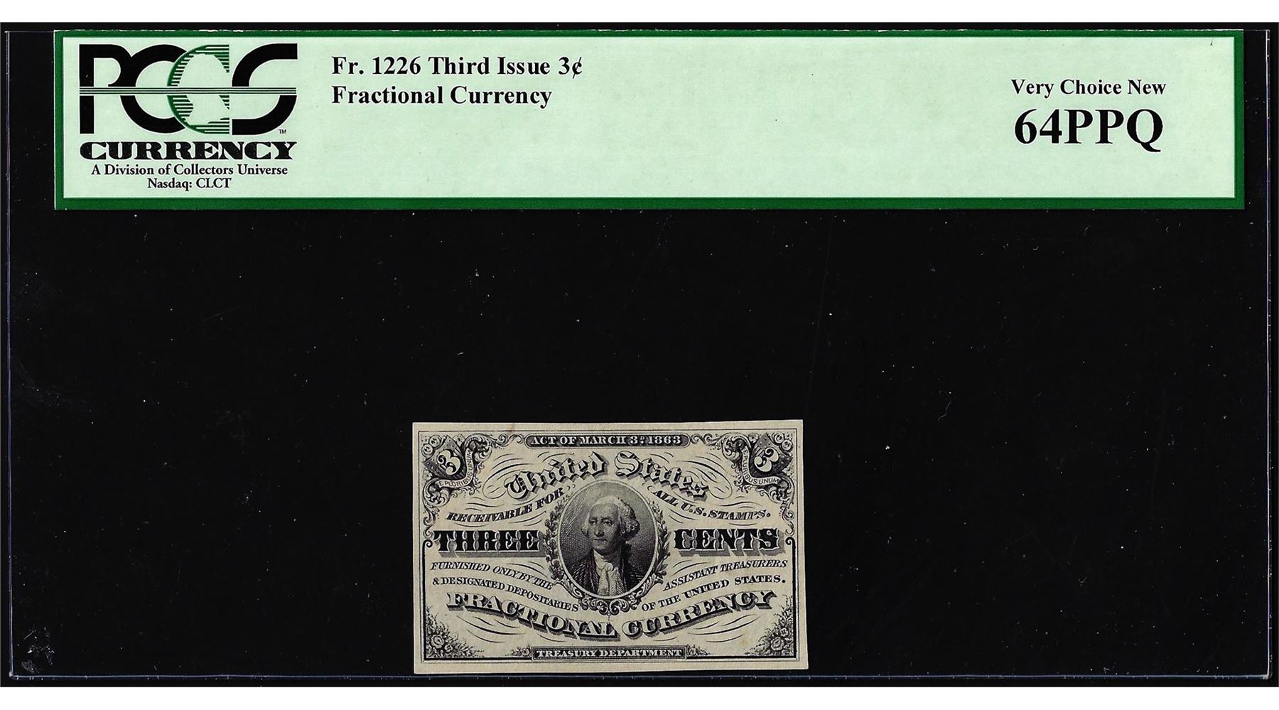 One 1863 Third Issue Three Cents Fractional Note Fr.1226 PCGS Very Choice New 64PPQ. PCGS Graded.