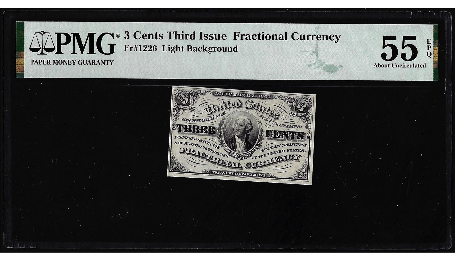One 1863 Third Issue Three Cents Fractional Note Fr.1226 PMG About Uncirculated 55EPQ. PMG Certified.