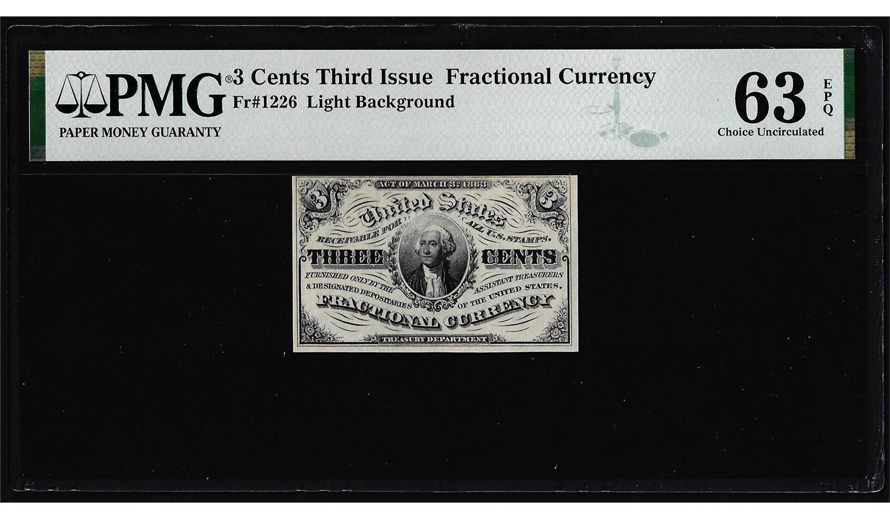 One 1863 Third Issue Three Cents Fractional Note Fr.1226 PMG Choice Uncirculated 63EPQ. PMG Certified.