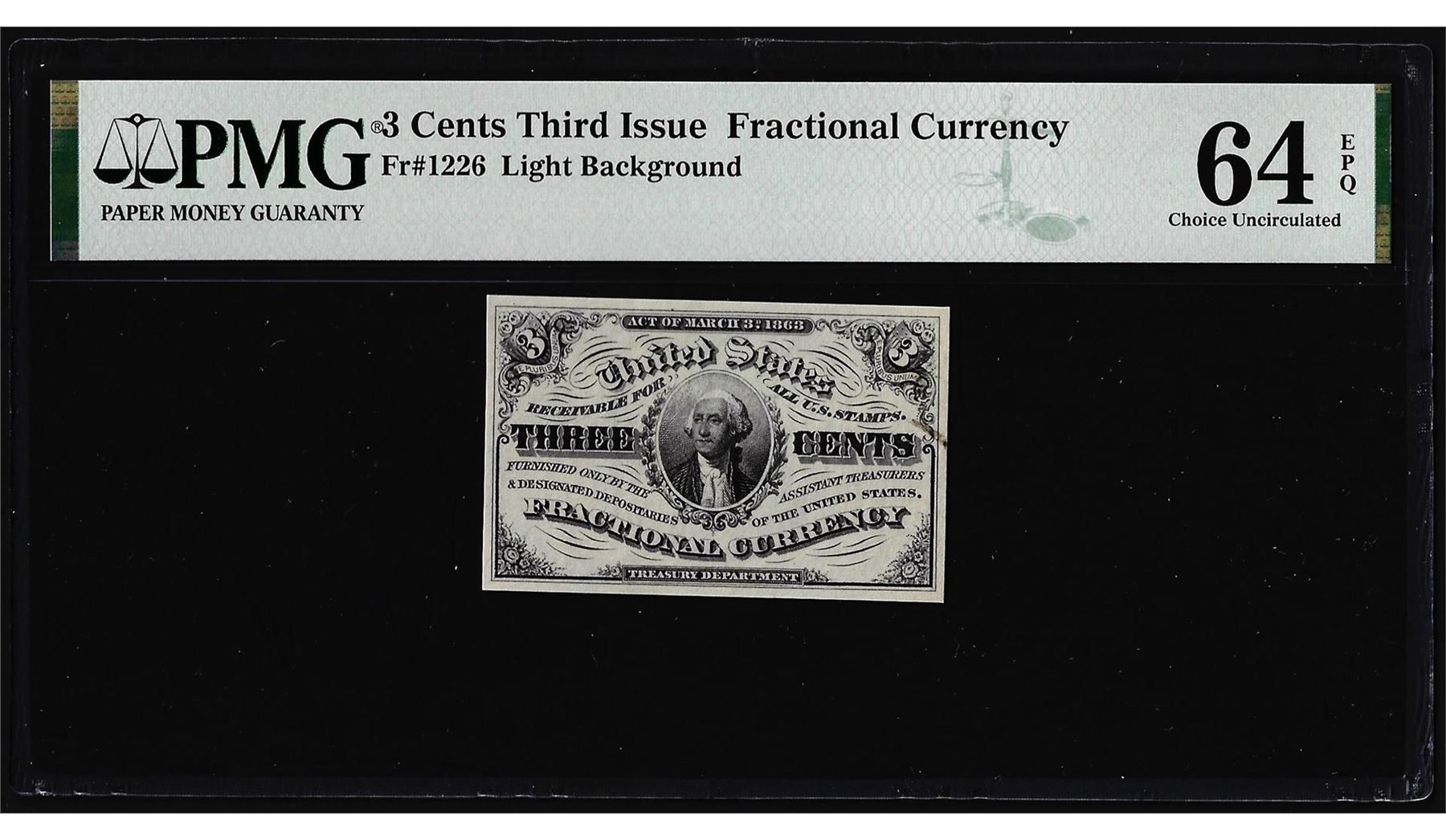 One 1863 Third Issue Three Cents Fractional Note Fr.1226 PMG Choice Uncirculated 64EPQ. PMG Certified.