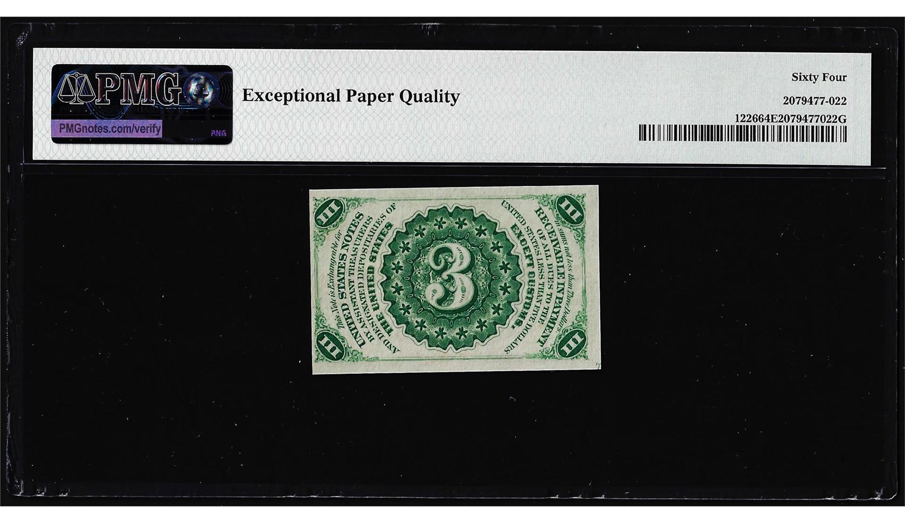 1863 Third Issue Three Cents Fractional Note Fr.1226 PMG Choice Uncirculated 64EPQ