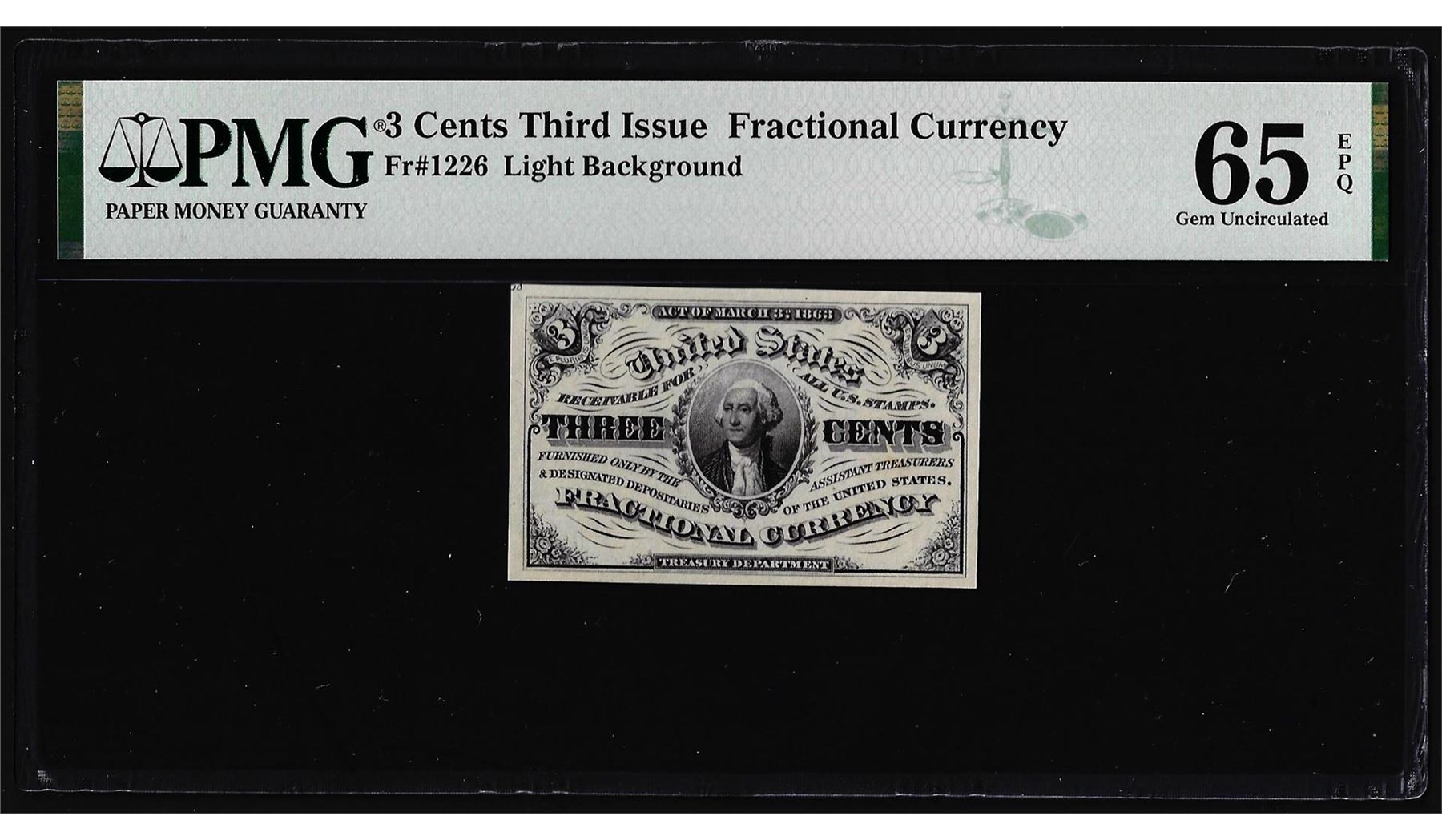 One 1863 Third Issue Three Cents Fractional Note Fr.1226 PMG Gem Uncirculated 65EPQ. PMG Certified.