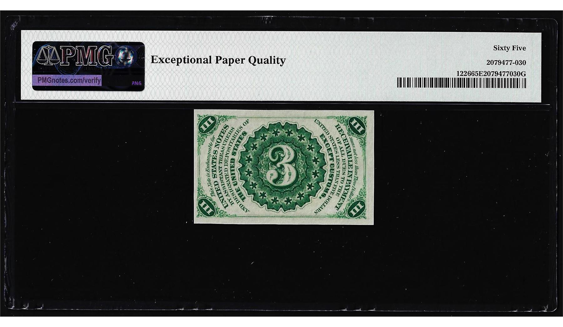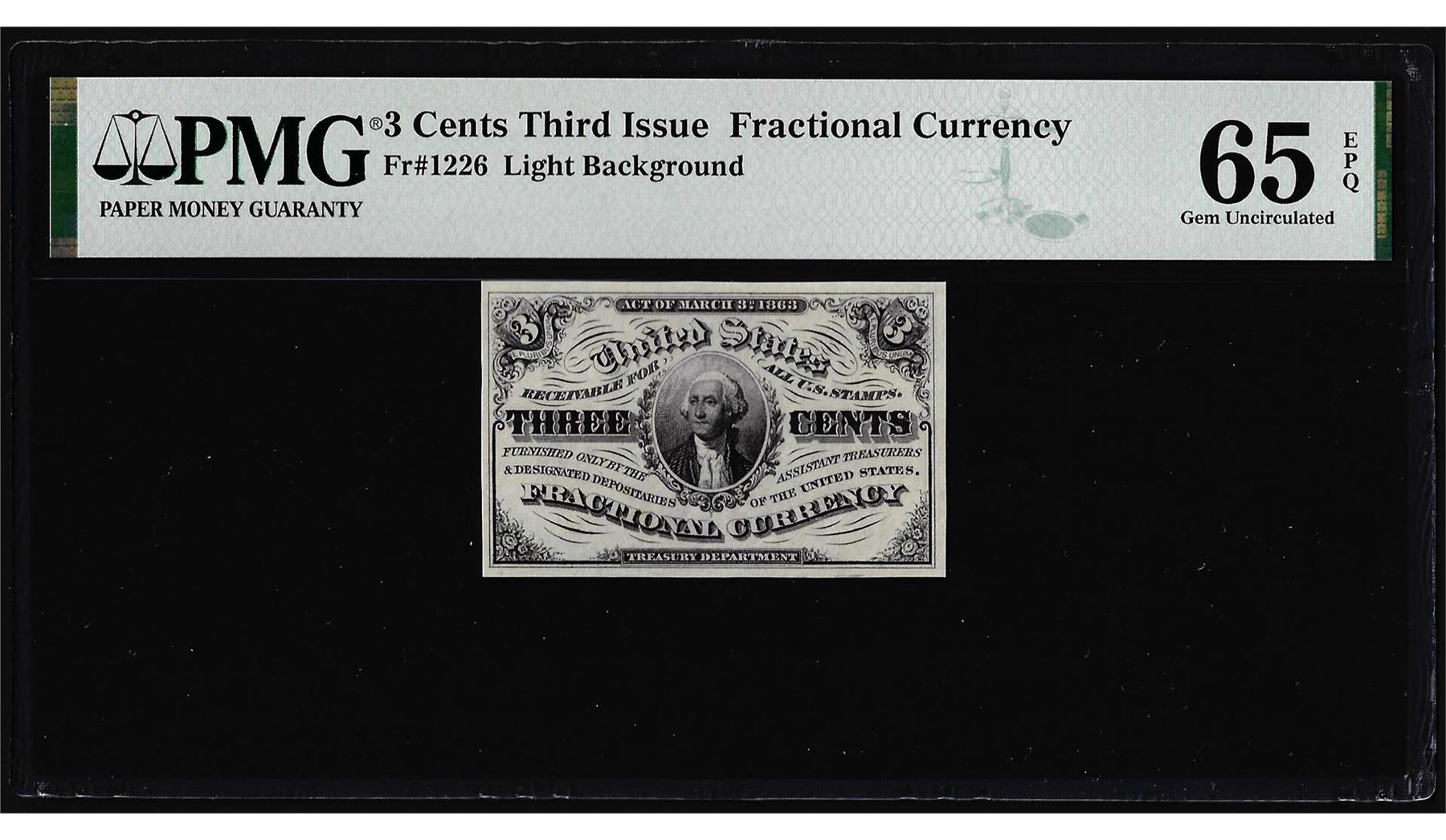 One 1863 Third Issue Three Cents Fractional Note Fr.1226 PMG Gem Uncirculated 65EPQ. PMG Certified.
