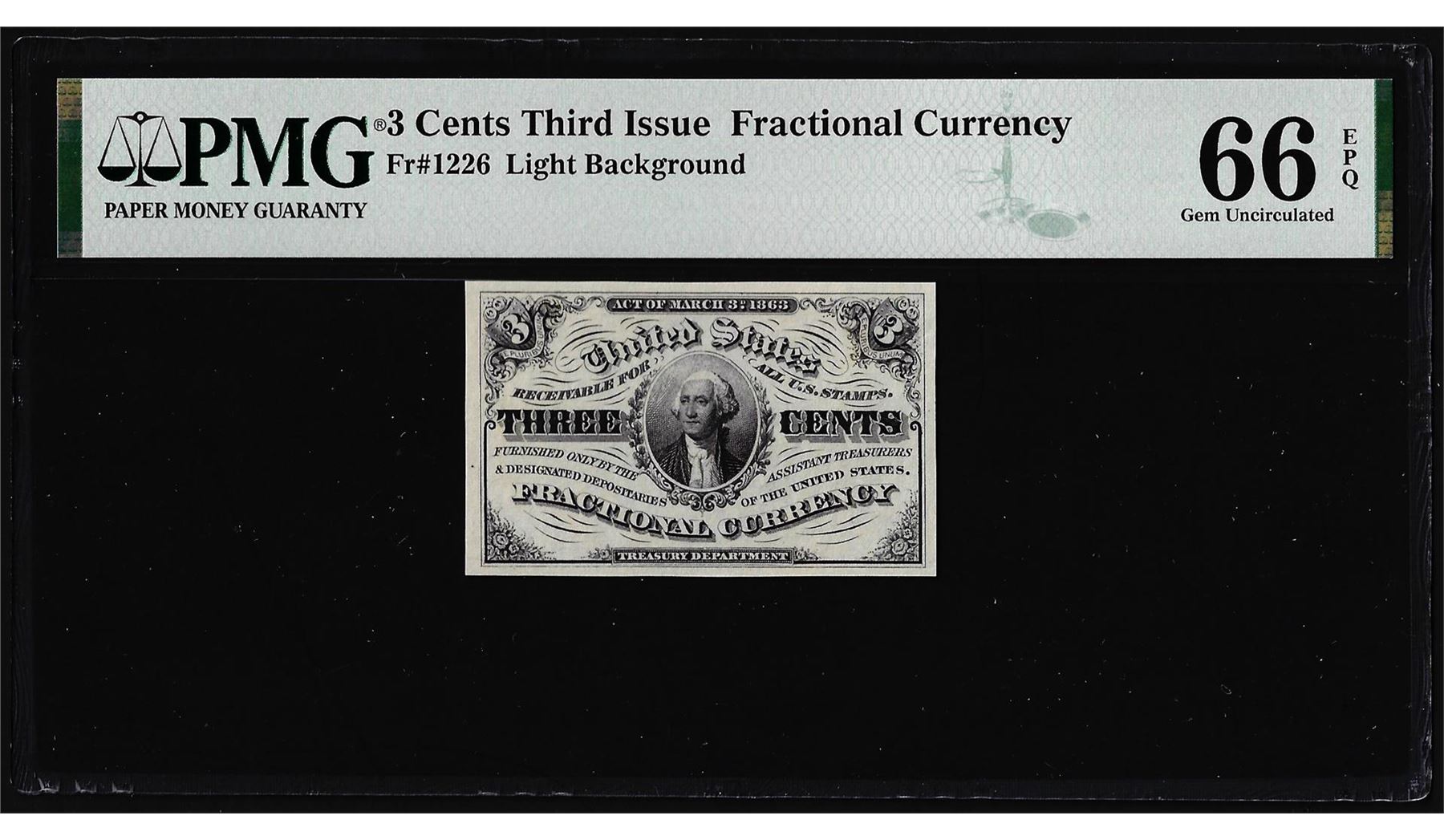 One 1863 Third Issue Three Cents Fractional Note Fr.1226 PMG Gem Uncirculated 66EPQ. PMG Certified.