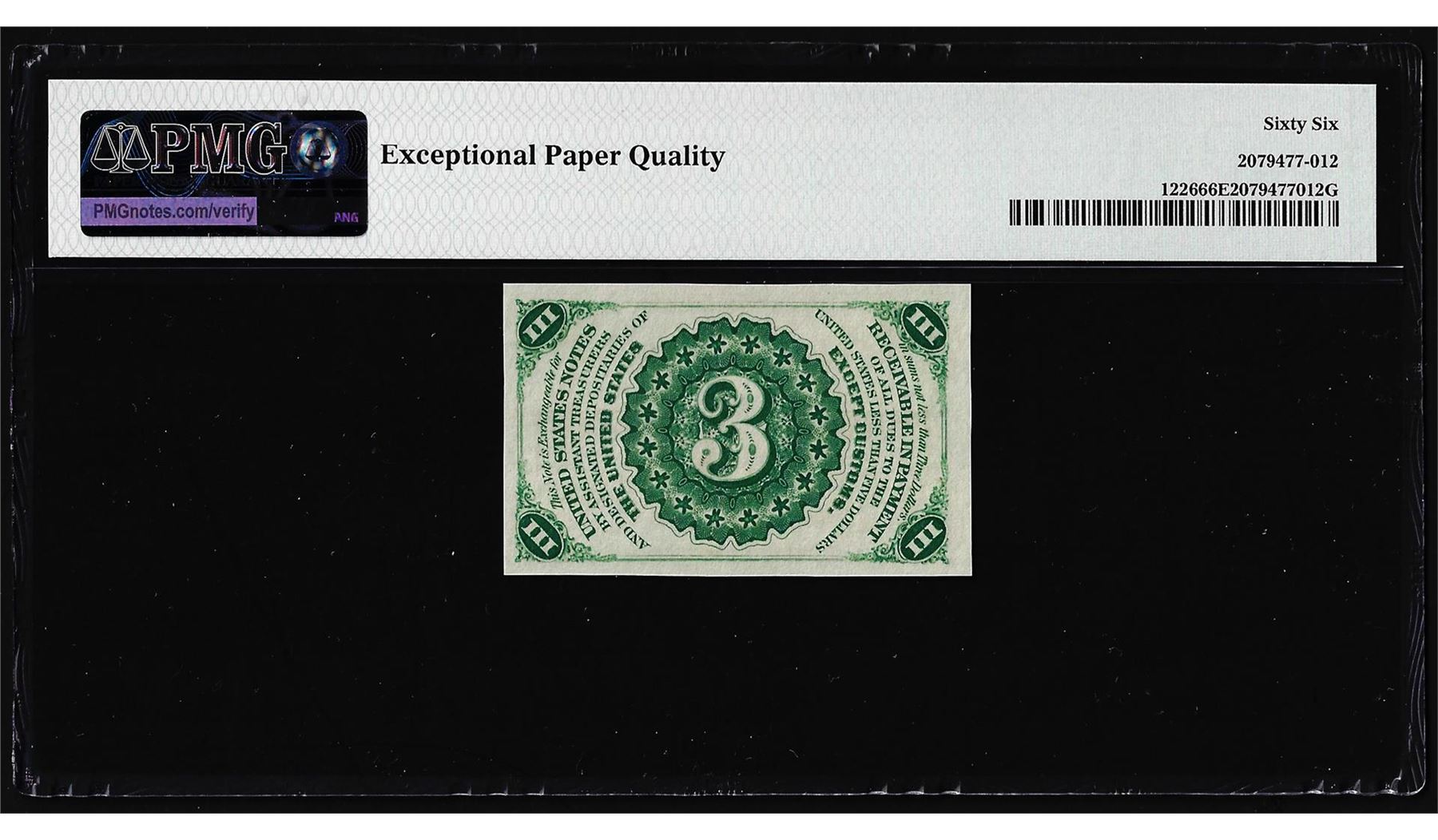 1863 Third Issue Three Cents Fractional Note Fr.1226 PMG Gem Uncirculated 66EPQ