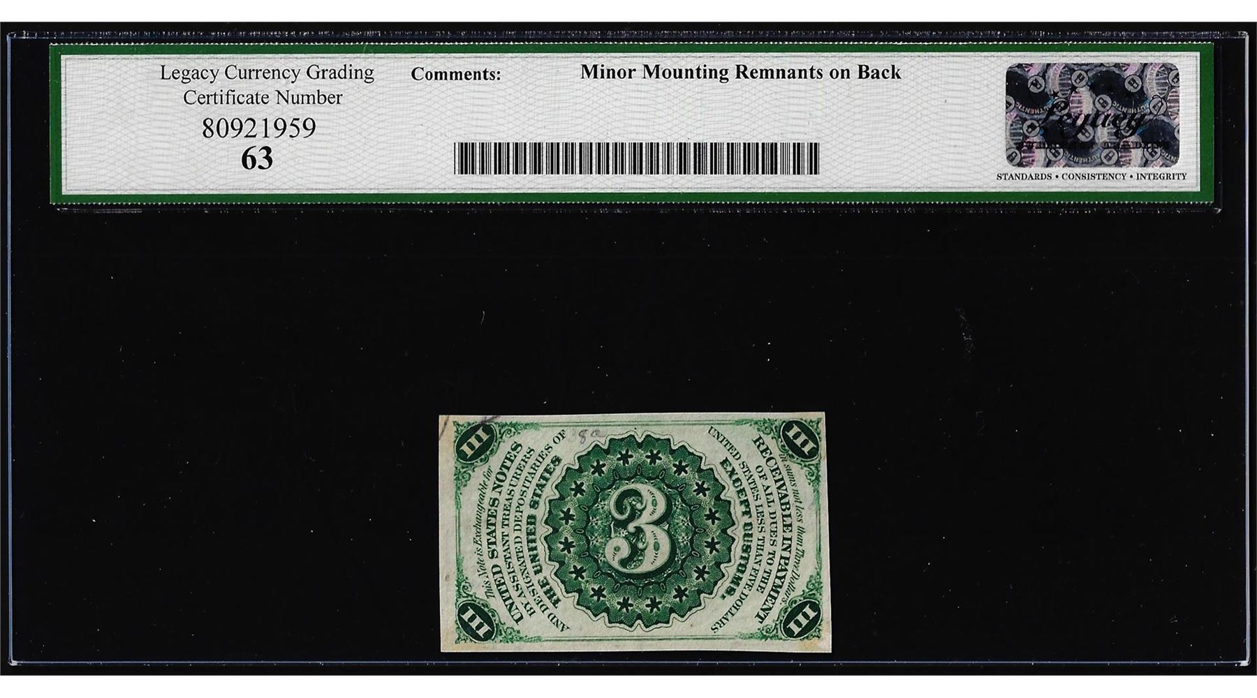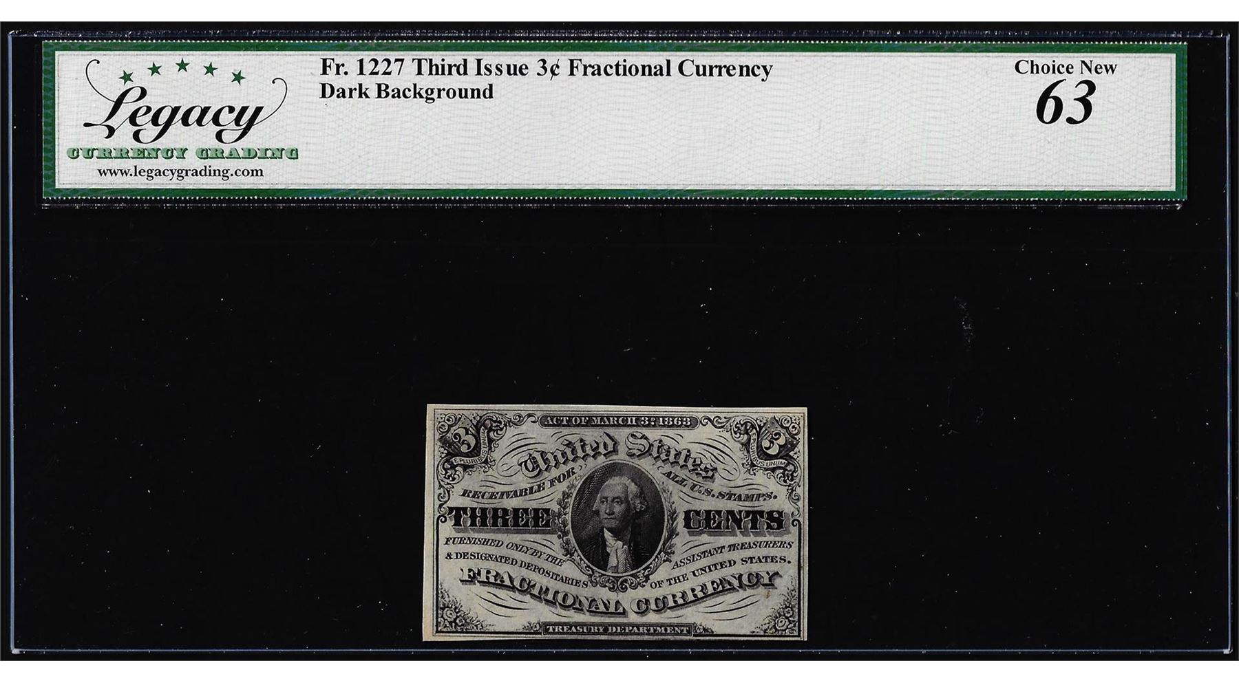 One 1863 Third Issue Three Cents Fractional Note Fr.1227 Legacy Choice New 63. Legacy Graded.