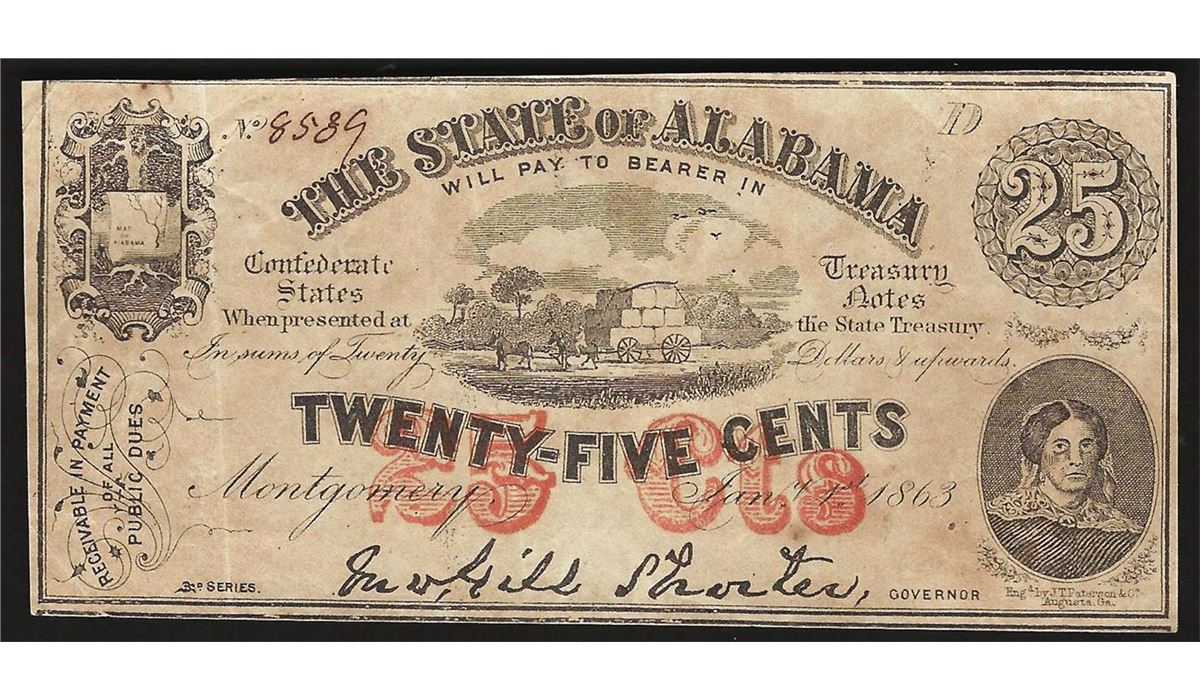 One 1863 Twenty-Five Cents The State of Alabama Obsolete Note.